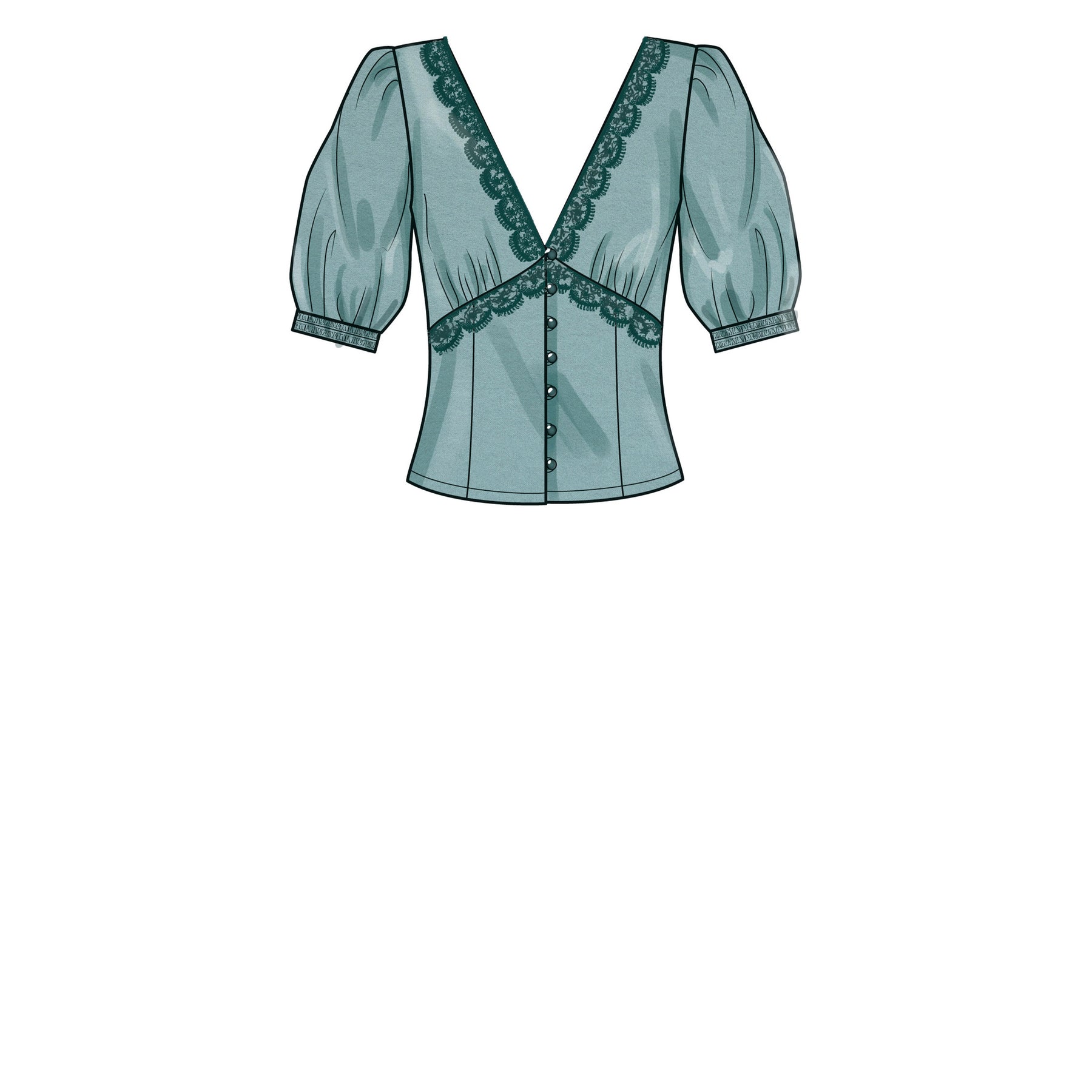 Die halb taillierte Bluse mit tiefem V-Ausschnitt oder Rundhalsausschnitt hat Knöpfe in der Mitte der Vorderseite und einen Selbstverschluss mit Untertritt und Spitzenbesatz als Optionen. Die Bluse hat Variationen für geraffte oder ausgestellte Ärmel oder ärmellos. Alle Ansichten haben Abnäher in der Taille.