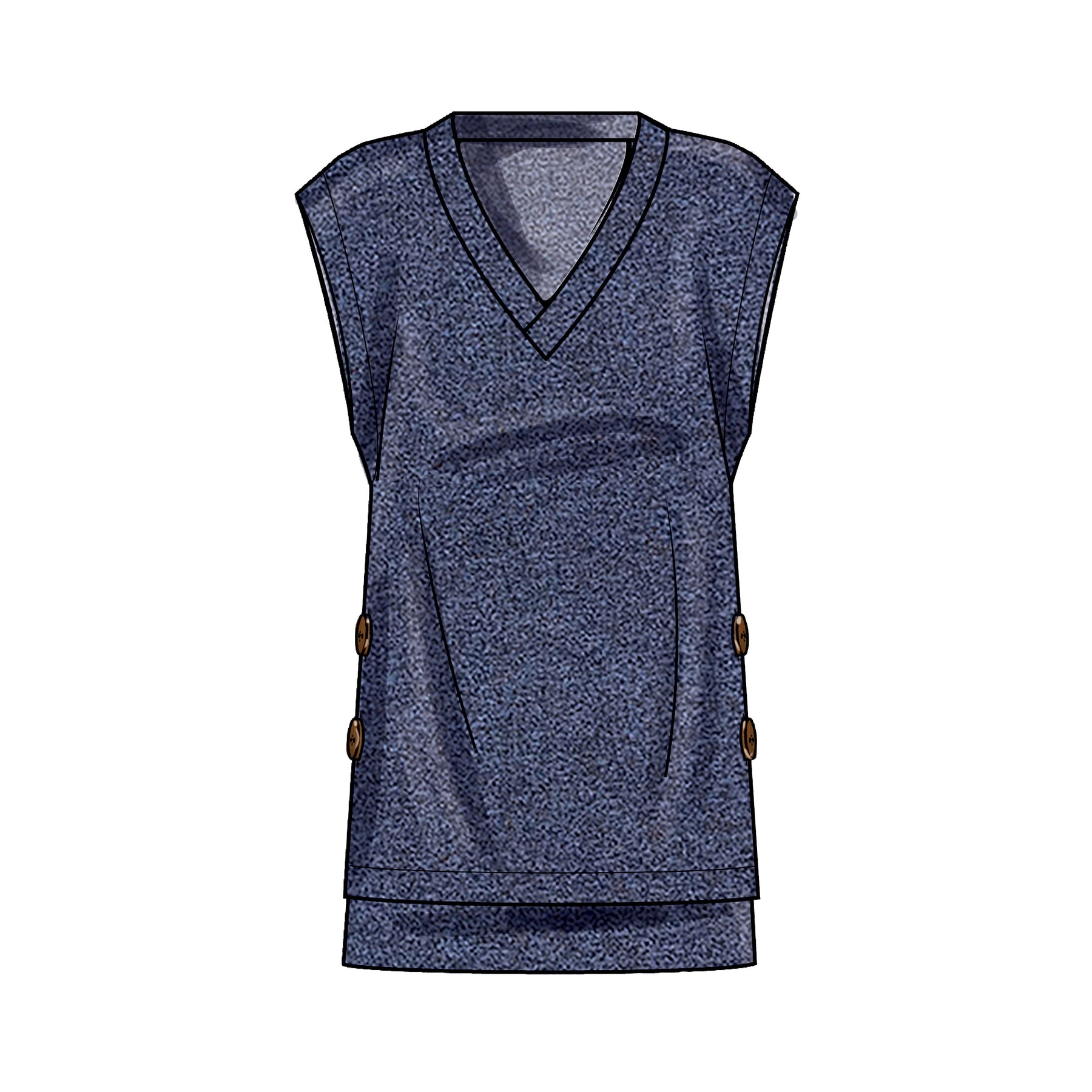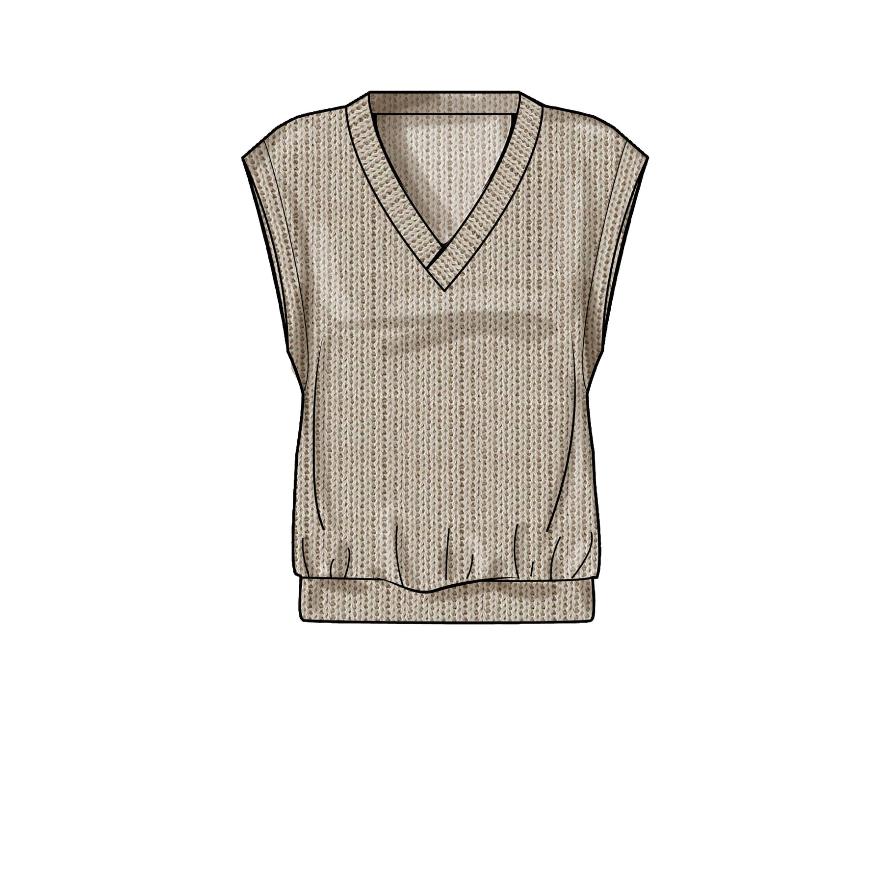 Strickwesten mit Knopfleiste in zwei Längen; die längere Version hat aufgesetzte Taschen vorne. Pull-on-Westen mit V-Ausschnitt, hochgezogenem Saum und seitlichen Knöpfen oder mit eigenem Band in der Taille.