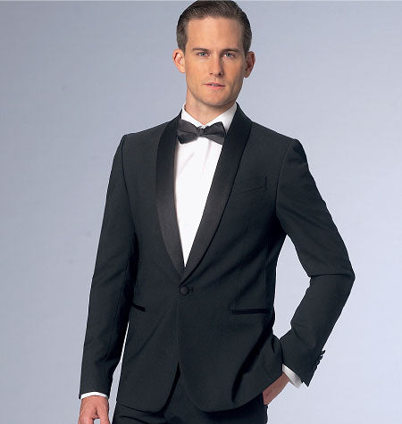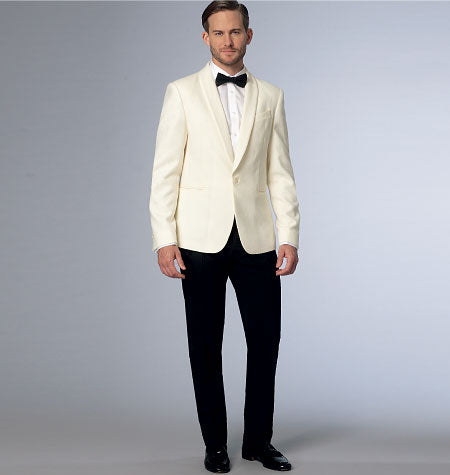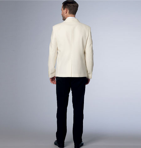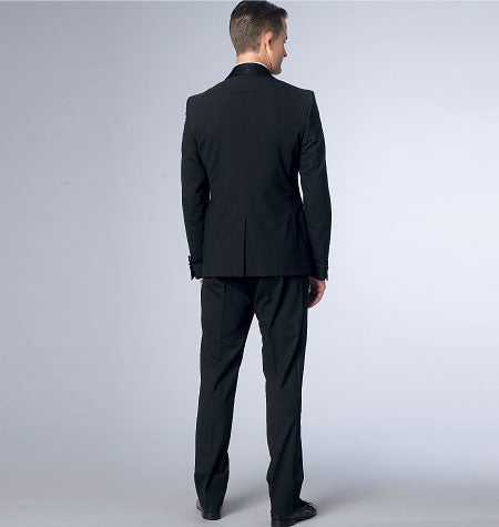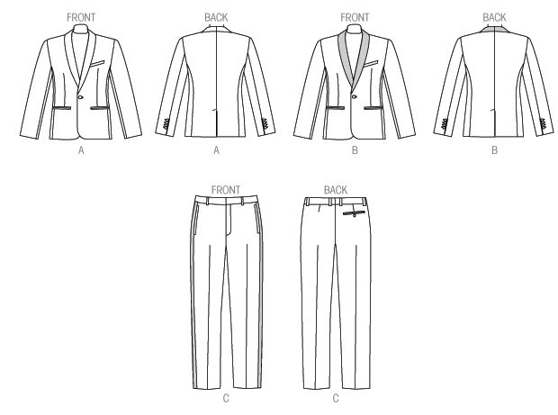 JACKE UND HOSE FÜR MÄNNER: Angepasstes, gefüttertes Sakko mit Kragen, Schulterpolstern, Seitenteilen, ohne Seitennähte, oberen, unteren und inneren Leistentaschen, Knopfleiste an der rechten Innentasche, Rücken- und Ärmelschlitzen, zweiteiligen Ärmeln, Knopf- und Knopflochleiste und Knopfleiste vorne (gebunden). Taillierte, konisch zulaufende Hosen (unterhalb der Taille) mit Bund, Trägern, Seitentaschen und -bändern, Gesäßtasche mit Knopfleiste und Hosenschlitz mit Reißverschluss. Besätze A, B, Bund C: Bias-Bindung. STOFFE: Gabardine, Krepp, Herrenanzug, Flanell. Kontrast: Satin, Faille. Einlage 1: Schmelzbares Nylon-Gestrick. Einlage 2: Haarleinen. Futter der Hose: Twill. Futter/Unterfütterung: Futterstoff. Ungeeignet für offensichtliche Diagonalen. *Mit Flor. **Ohne Flor.