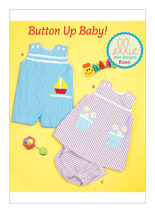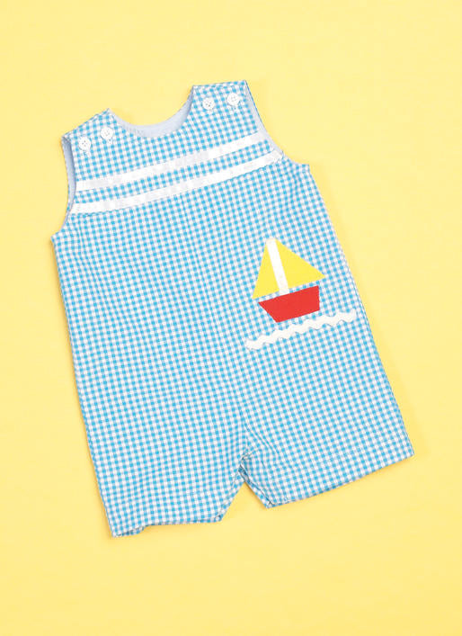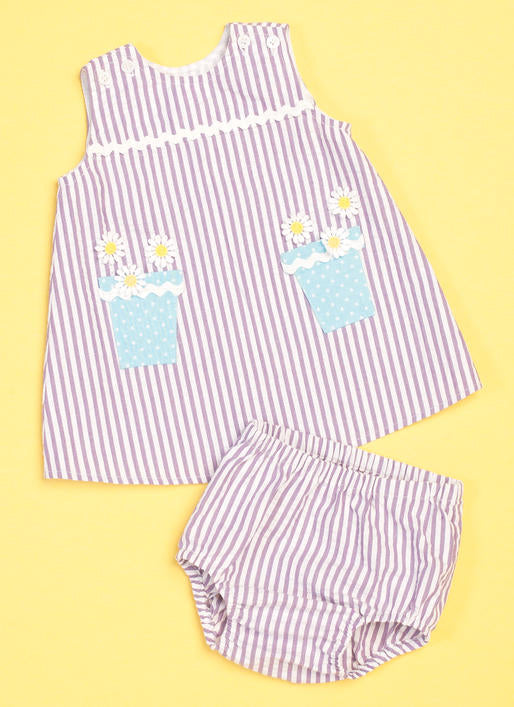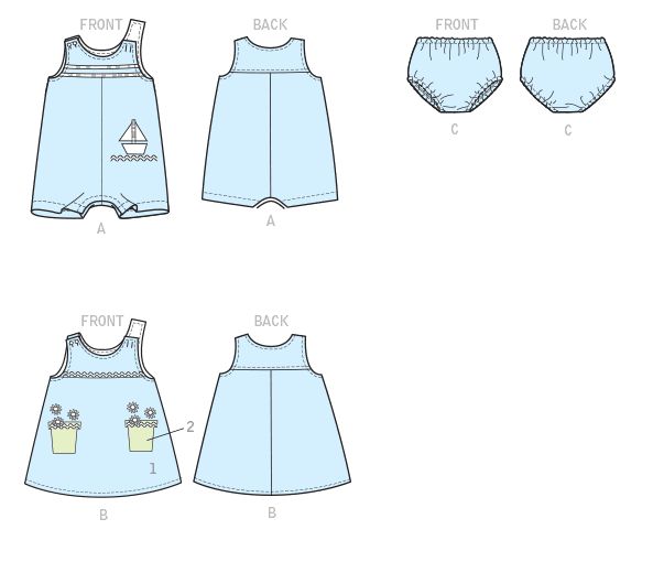 This adorable overalls, dress and panty set is perfect for your little one! The overalls and dress have lined yokes with front shoulder button closures. Overalls A have ribbon trim on yoke, fabric boat with sail appliqués and snap tape closure on inside leg seams. Dress B has rickrack trim on yoke and on contrast pockets, and purchased flower appliqués. Panties C has casing with elastic at waist and leg openings.