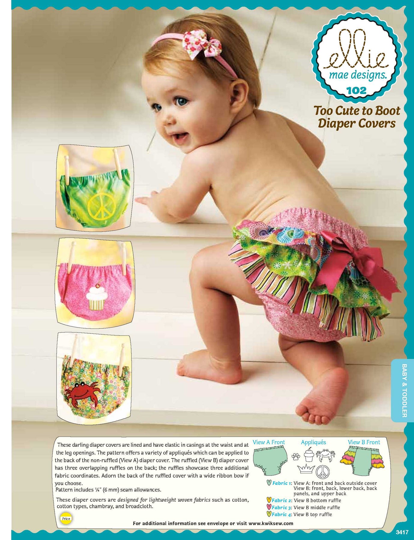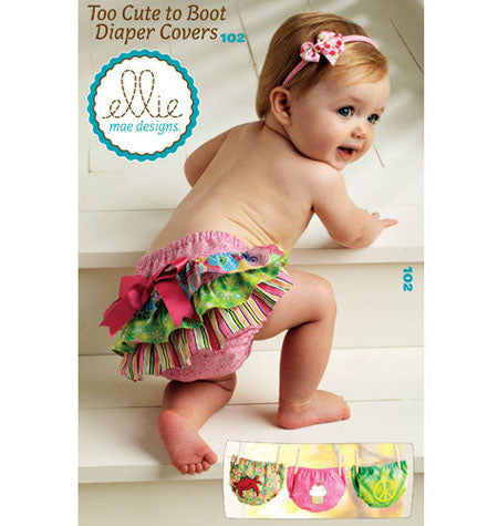Schnittmuster Ellie Mae 102 Süße Windel-Überhöschen Diese süßen Windel-Überhöschen sind gefüttert und haben einen Gummizug in Taille und entlang der Beinausschnitte. Das Schnittmuster bietet mehrere Applikationsvorlagen, die auf die Hinterhose der nicht-gerüschten Überhose (Modell A) appliziert werden können. Die gerüsche Überhose (modell B) hat drei sich überlappende Rüschen entlang der HInterhose, die Rüschen können drei schöne Kontraststoffe schön zur Geltung bringen. Verzieren Sie die Rüschen-Überhose noch mit einer breiten Satin-Schleife. 6 mm Nahtzugabe sind im Schnitt bereits enthalten. Diese Windel-Überhosen sind geeignet für leichte Webstoffe, z.B. Baumwollstoffe.
