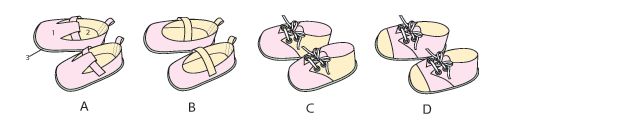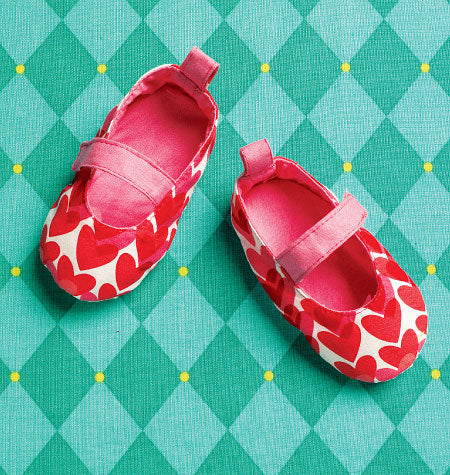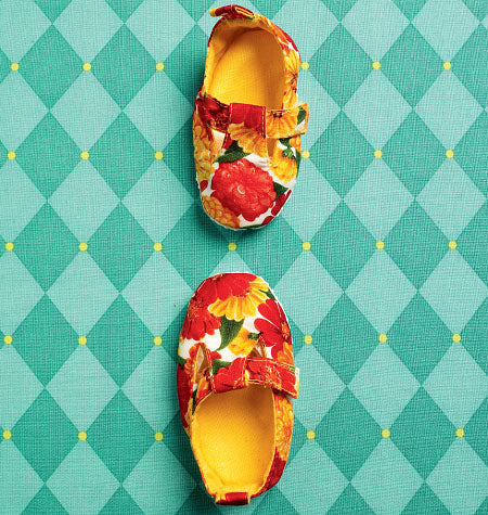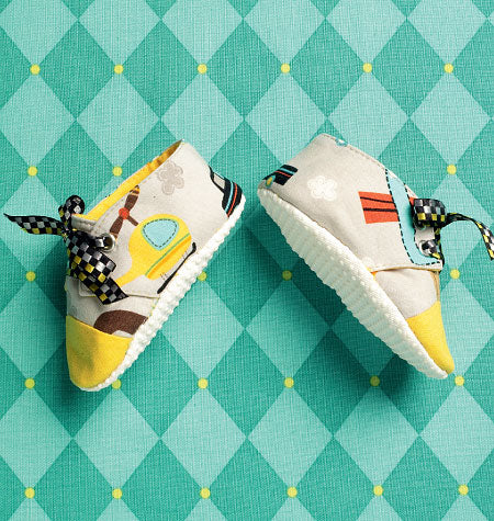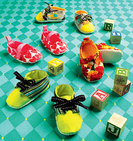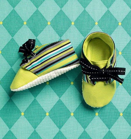 Your little one will be "stepping" out in style with these adorable baby booties Booties have non-slip soles. Views A and B have Velcro® closures and back loops. Views C and D have ribbon ties laced through grommets. The booties are designed for lightweight woven fabrics such as cottons, cotton types. Sole: Gripper fabric.