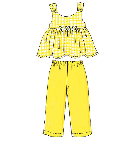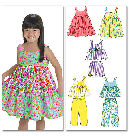 Tolles Sommeroutfit für junge Damen. Pulloveroberteile A, C und Kleider B, D, E haben eine erhöhte Taille und Schulterriemenvarianten. Kleider D, E: Geraffte Bahnen. Oberteil C, Kleid D: Kontrastfarbene Abschnitte. Shorts F und Hosen G haben elastische Hüllen in der Taille. Oberteil A, Shorts F: Gekaufte Applikationen.