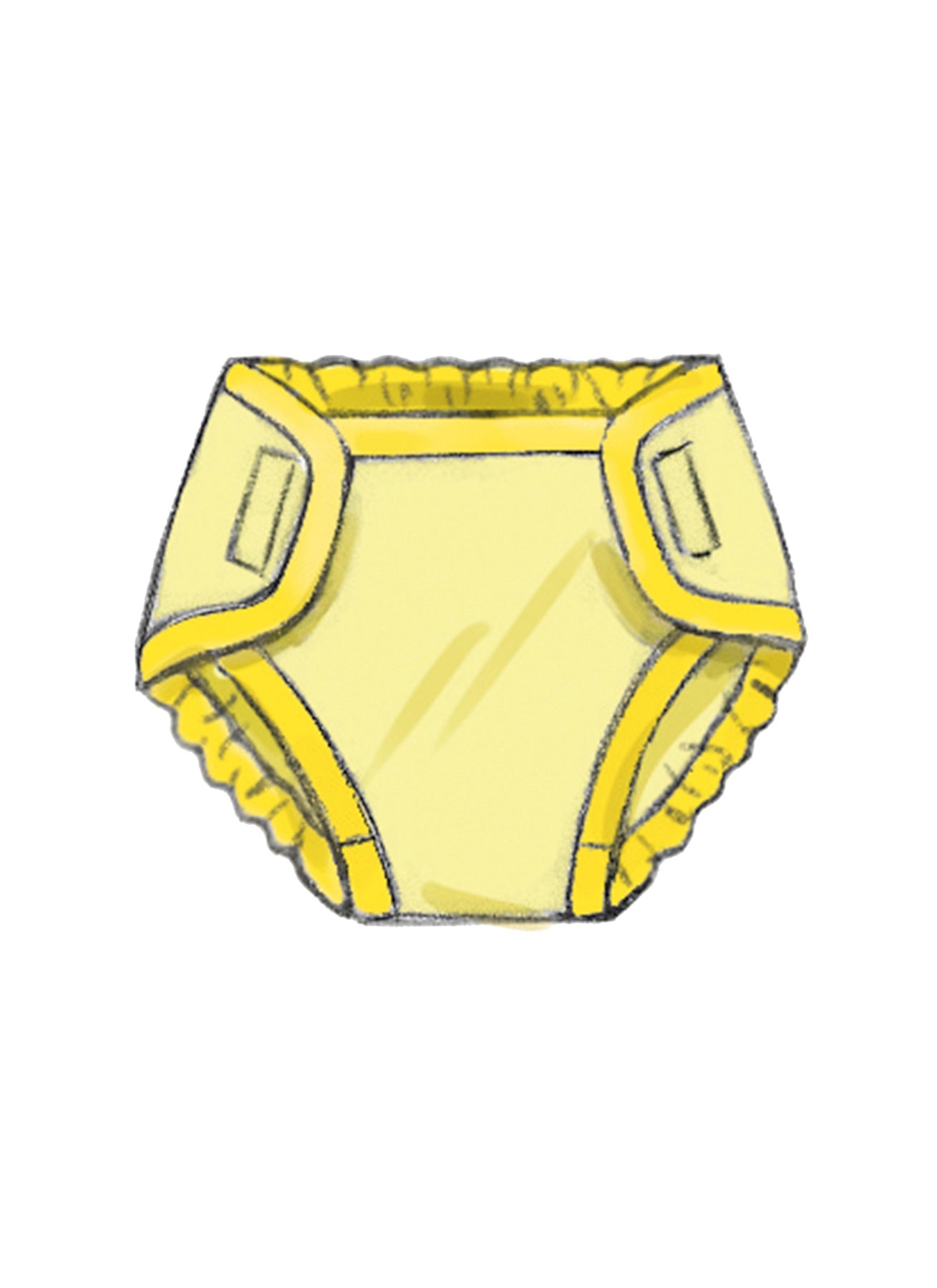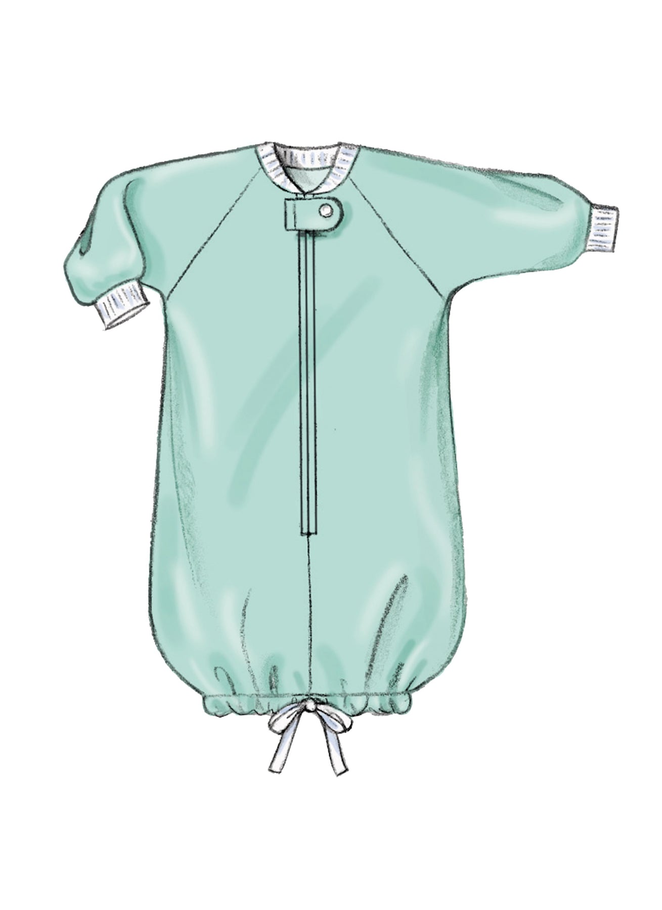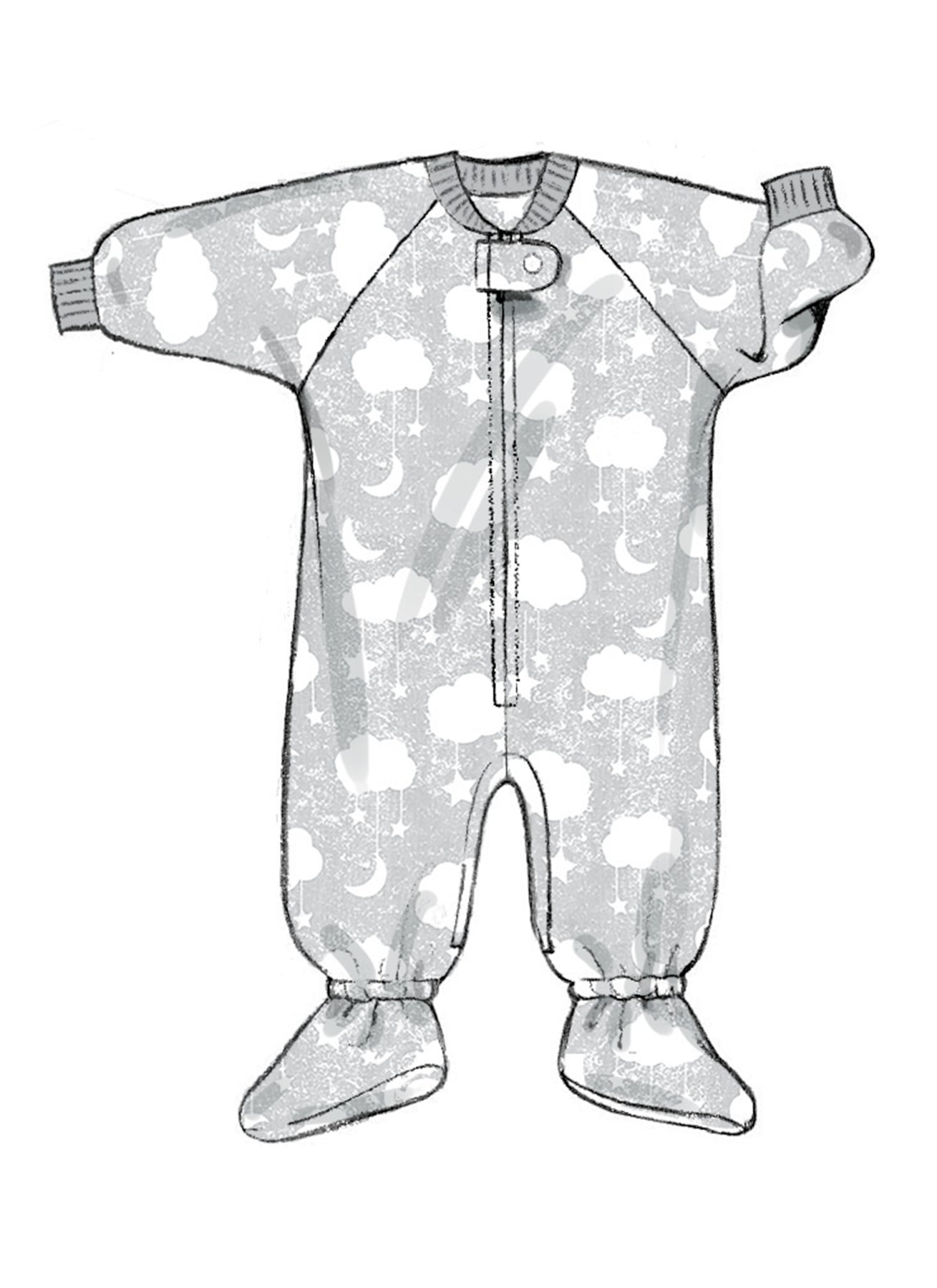 Locker sitzende Strampler A, B oder Jumpsuit C haben ein Nackenband, einen Reißverschluss vorne, eine Lasche mit Druckknopf und lange Ärmel mit Bündchen. Ansicht B hat einen Kordelzug. Ansicht C hat einen Gummizug an den Beinen. Das locker sitzende Shirt hat Mockbands, einen Druckknopfverschluss, genähte Säume und kurze Ärmel. Der Windelbezug hat einen teilweisen Gummizug in der Taille und an den Beinen mit Klettverschluss. Der Hut hat eine umgeschlagene Krempe. Lätzchen mit Klettbandverschluss und gekaufter Applikation. Fäustlinge und Füßlinge haben einen Gummizug. Selbstgefütterte Decke. Windelbezug, Lätzchen und Decke haben eine gekaufte Verzierung.