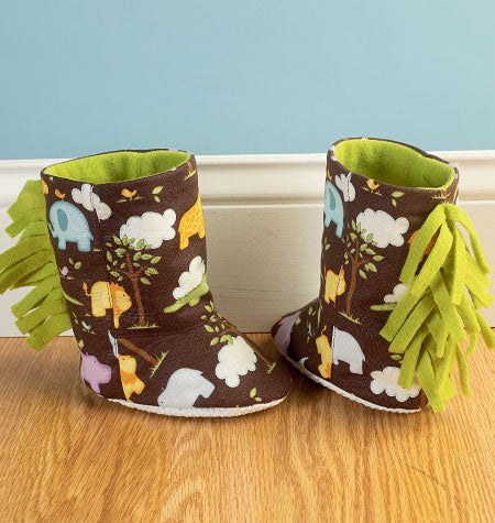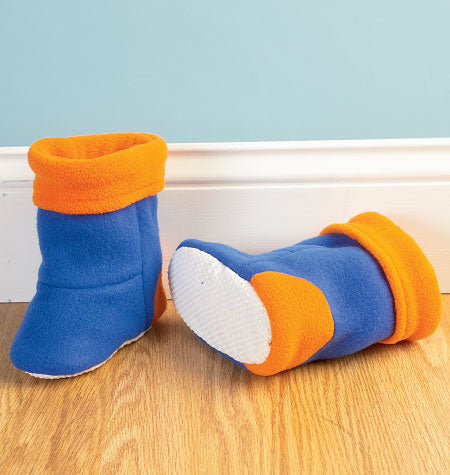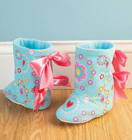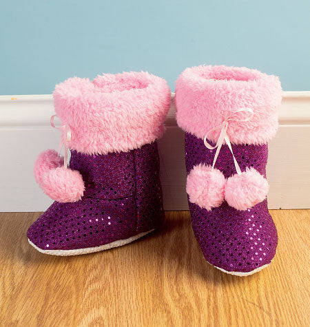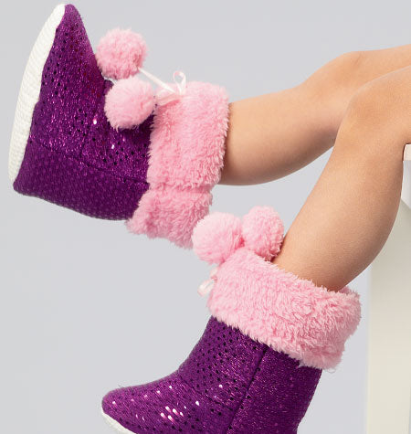 Four slippers in size X-small, Small, Medium and Large. View A: Purchased ribbon for bows. View B: Contrast back fringe. View C: Contrast cuff and ribbon ties with attached pompom. View D: Contrast heel appliqué and cuff. All views have contrast lining.