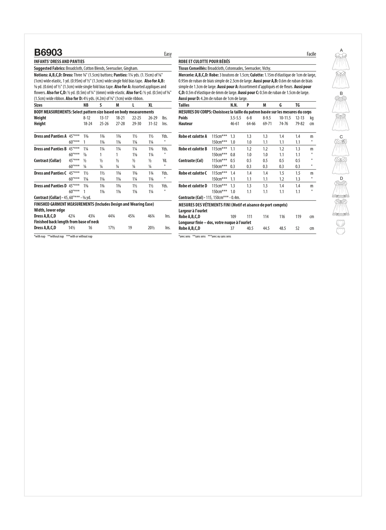 Das Butterick Schnittmuster B6903 bietet ein bezauberndes Babykleid mit vollständig gerafftem Rock, das wahlweise ärmellos oder mit kurzen, süßen Puffärmeln genäht werden kann. Passend dazu gibt es ein niedliches Höschen, das den Look komplettiert. Verschiedene Kragenvariationen und praktische Knopfverschlüsse auf der Rückseite sorgen für individuellen Stil und einfachen An- und Auszug. Besonders charmant ist Ansicht A mit liebevollen Applikationen und Blumenmotiven, die dem Outfit eine verspielte Note verleihen. Dieses Schnittmuster ist ideal, um einzigartige und komfortable Babybekleidung selbst zu gestalten.