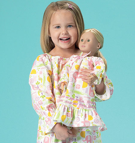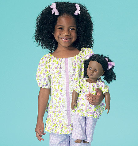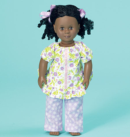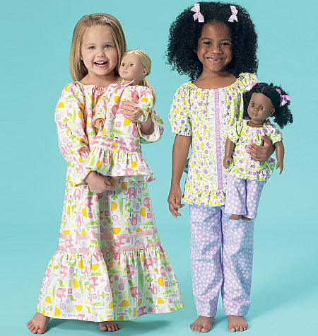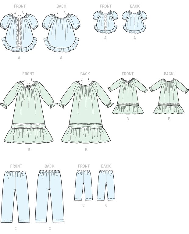 Pullover Top and Gown have casings with elastic at neck and sleeve, ruffles at bottom edge and embellished with trim. Top A: Short sleeves with ribbon and lace trim on front. Gown B: Long sleeves with bias tape for sleeve casing, ribbon bow and double row of ribbon trim at top of ruffle. Pants C are pull-on with elastic in waist casing. Matching outfits fit an 18" doll and have back openings with Velcro® closures.