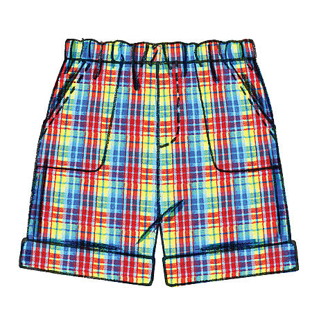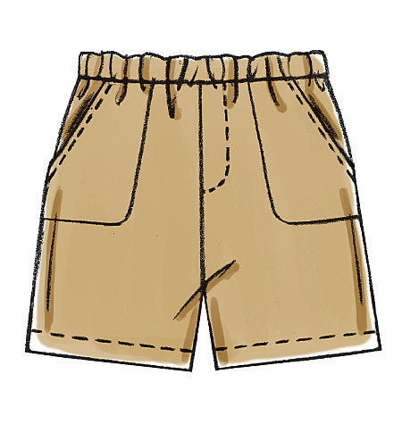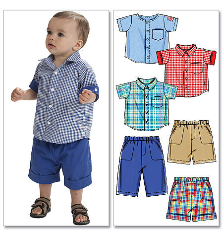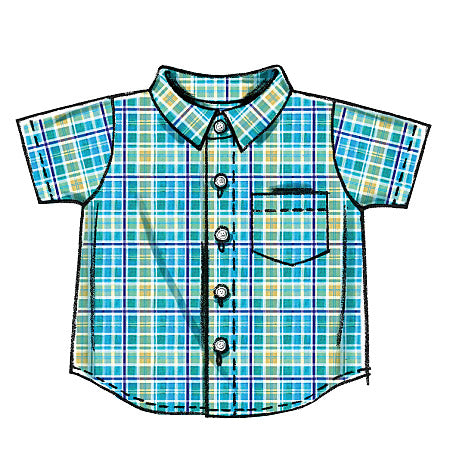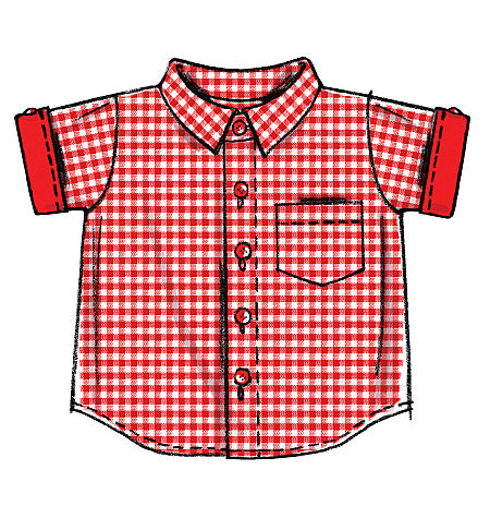 Die Hemden haben eine Brusttasche, kurze Ärmel und einen Knopf- oder Druckknopfverschluss. A: Halsausschnitt mit Schrägband, Ärmelapplikation. B, C: Kragen und Kragenband. C: Kontrastfarbene Manschette. Kurze Hosen D, E oder F: Schräge Seitentaschen, Taillengürtel. D, F: Abgenähte Säume. E: Manschetten.