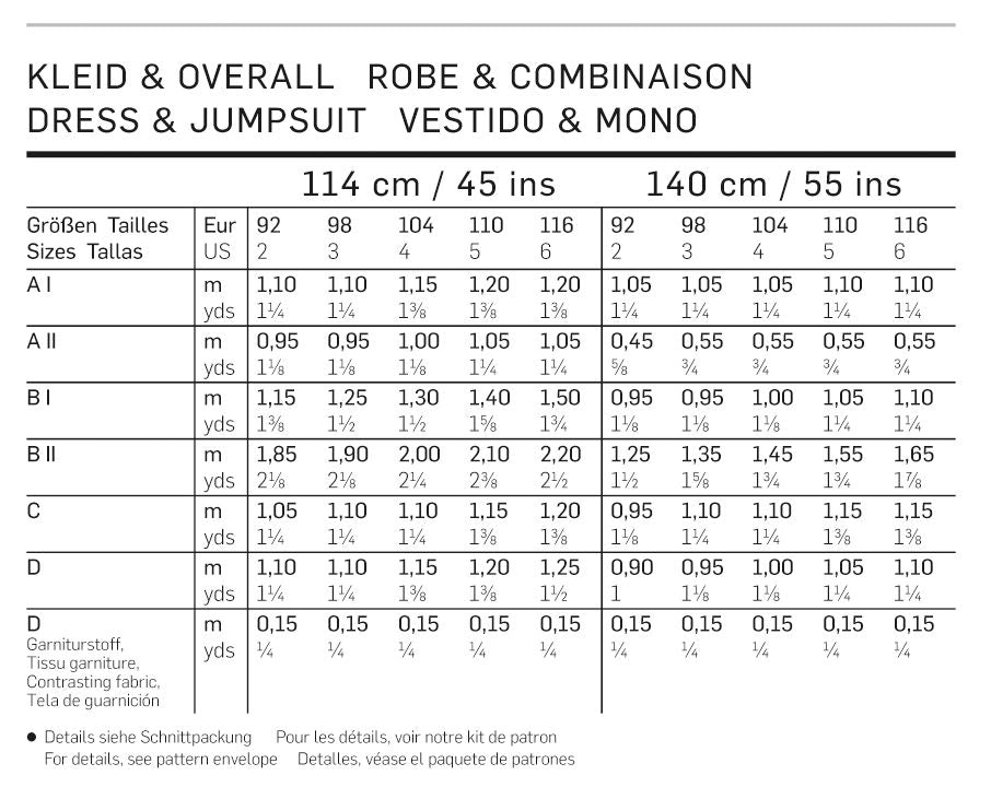 Kleid in zwei Längen, mal festlich, mal verspielt interpretiert. Kleid A und B mit geteiltem Überrock und hinten zur Schleife gebundenen Bindebändern. Kleid C hübsch mit seitlichen Schleifchen. Im luftigen Overall mit Bündchen lässt es sich herrlich toben. Alle bequem mit Knopfverschluss an den Schultern.