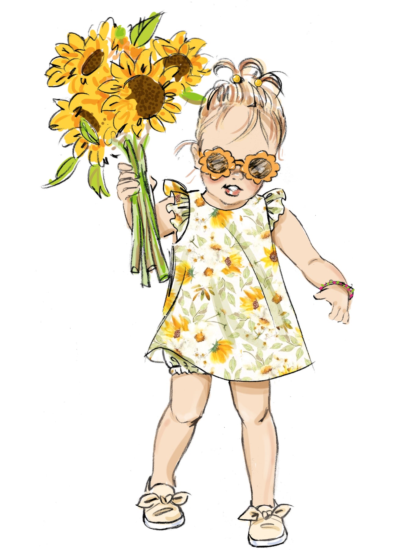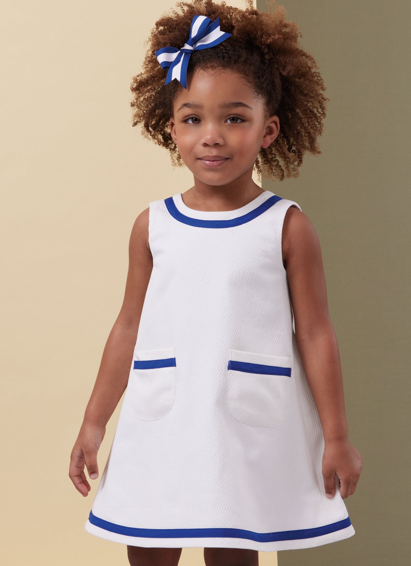 Die Kleider haben eine interessante Rückenpartie mit verschiedenen Verzierungen. Ansicht A hat geraffte Kappenärmel. Ansicht C ist farblich abgesetzt. Die Kleider der Ansichten A und B haben Knöpfe am Rücken. Die Ansichten C und D haben Knöpfe an den Schultern. Die Höschen haben einen Gummizug in der Taille und an den Beinen.
