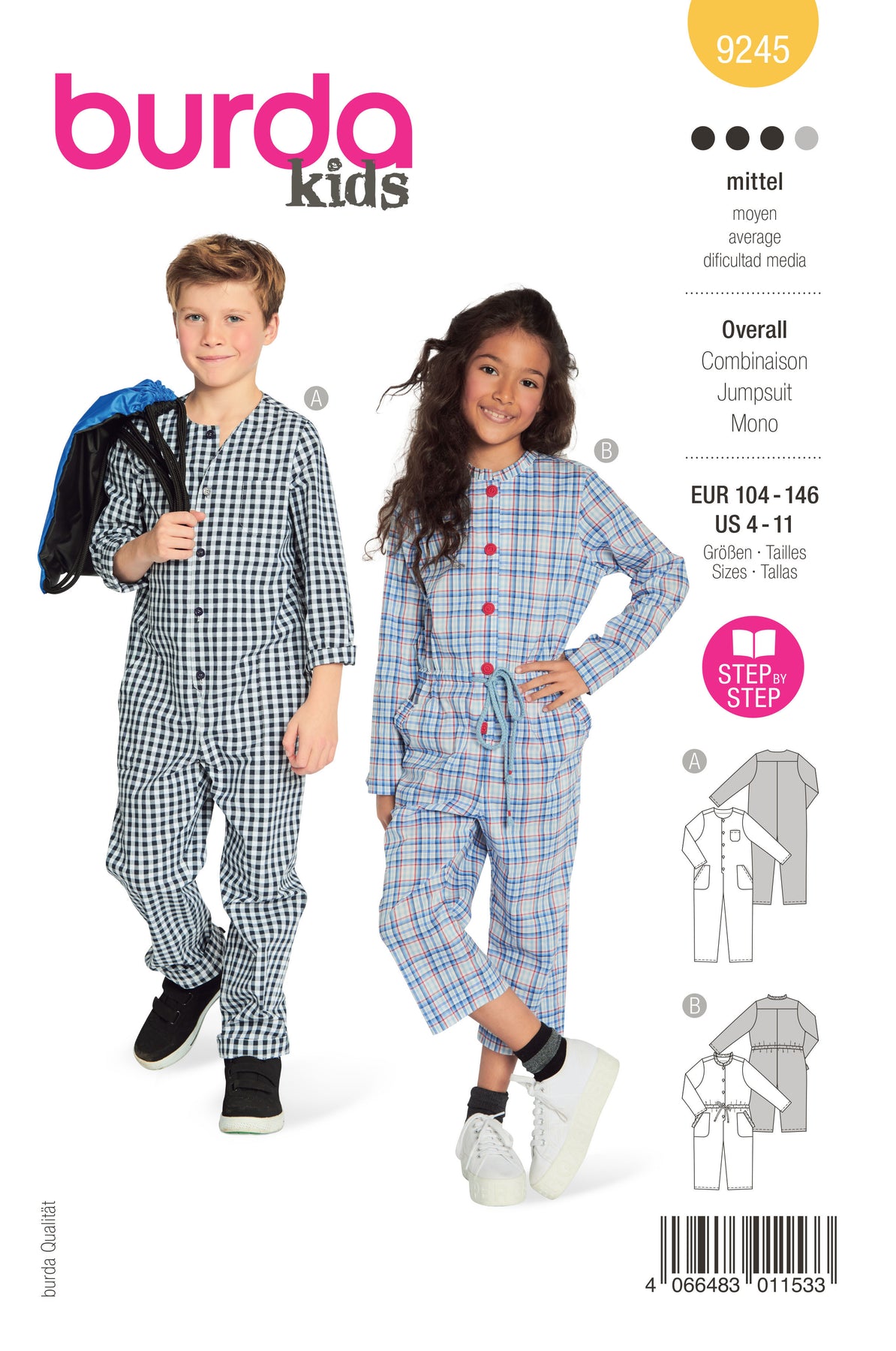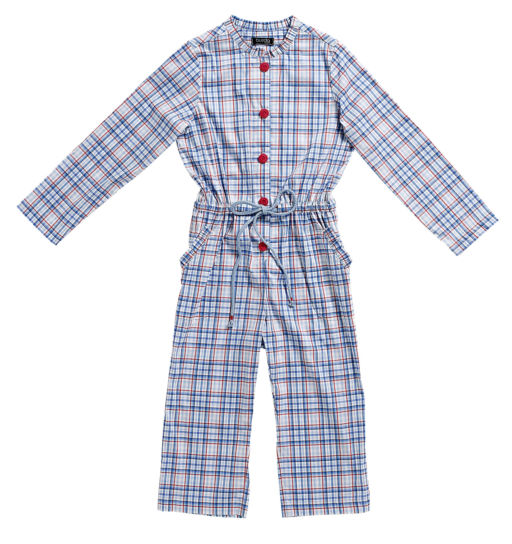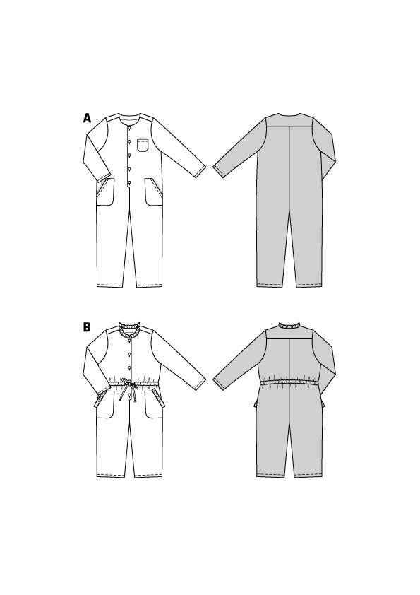 Bequemer Overall zum Knöpfen und mit aufgesetzten Taschen - für Mädchen und Jungs gleichermaßen geeignet. Einteiler B wird mit Rüschen und einer Kordelblende in der Taille ganz feminin. Arme und Beine können bei beiden Varianten auch lässig gekrempelt werden.