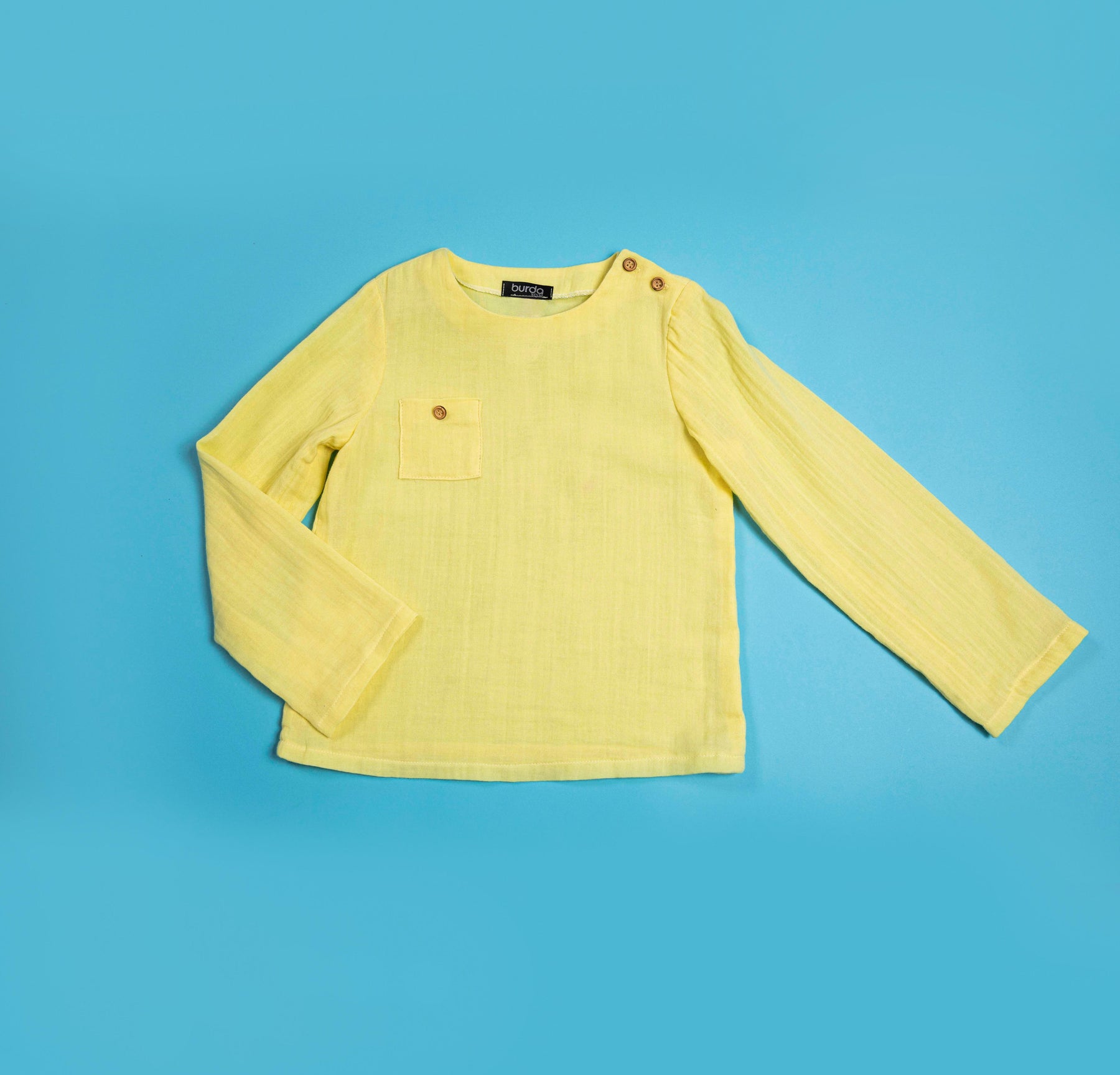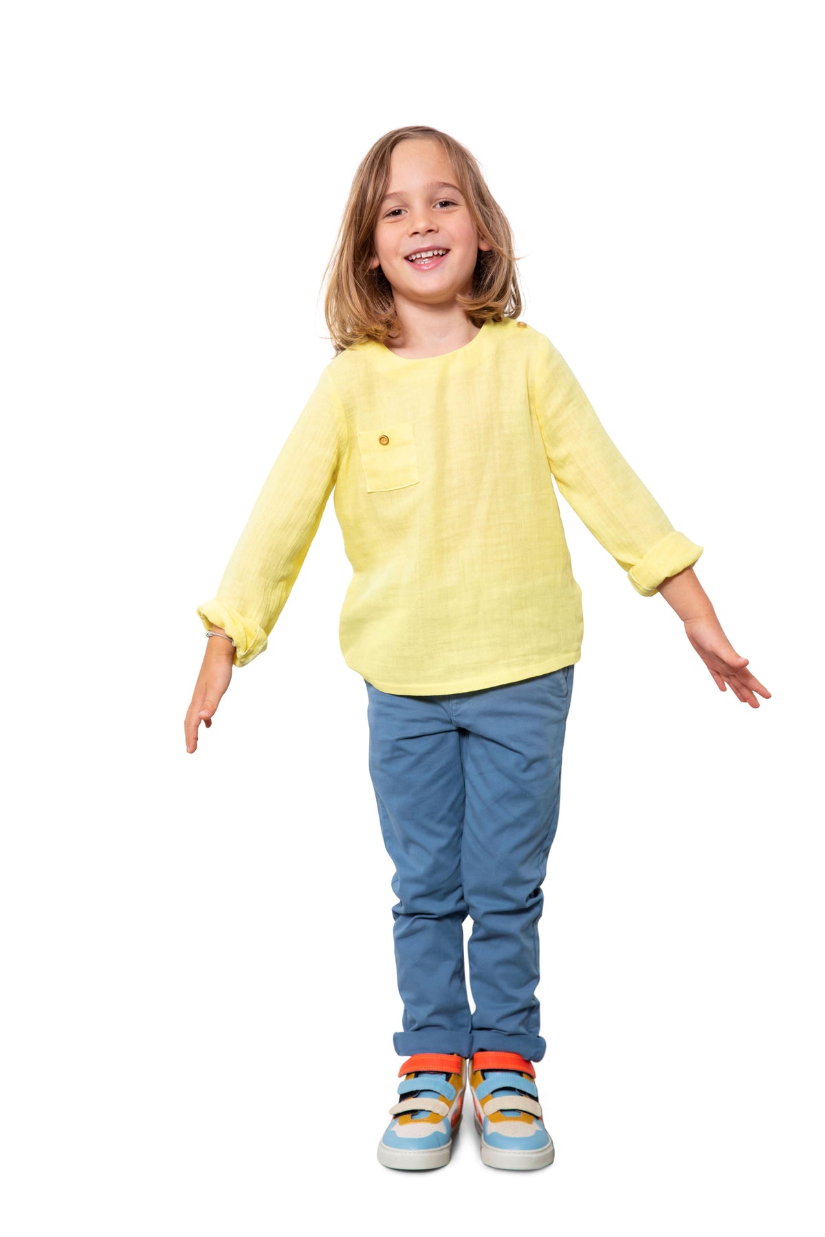 Da kommt Sommerfreude auf! Das Schnittmuster für das Unisex-Shirt, das wir in zitronengelb genäht haben, begeistert Jungs und Mädchen mit lässigem Schnitt. Das Shirt mit Flügelärmeln und Knöpfen erhält ein Style-Upgrade und passt zu Jeans, Shorts oder Röcken. Nähspaß für Kindersommerkleidung in Schwierigkeitsstufe 2!