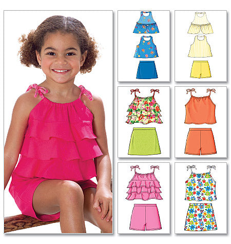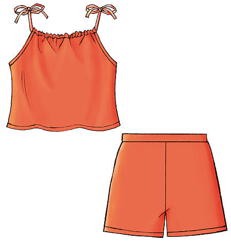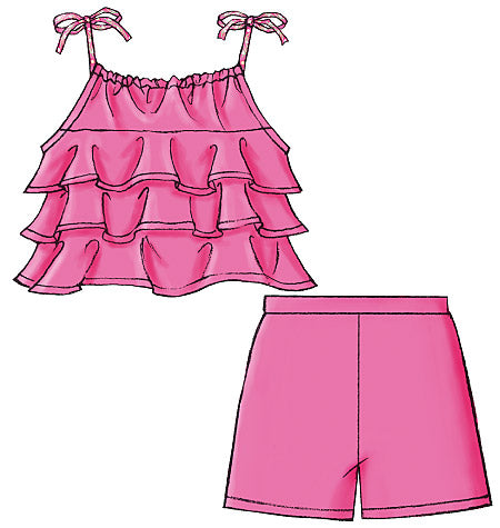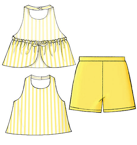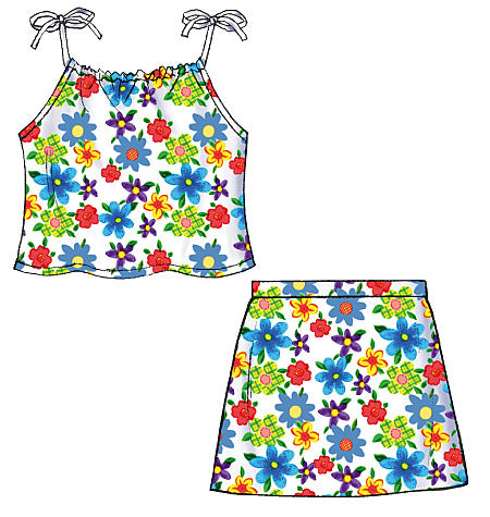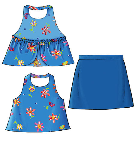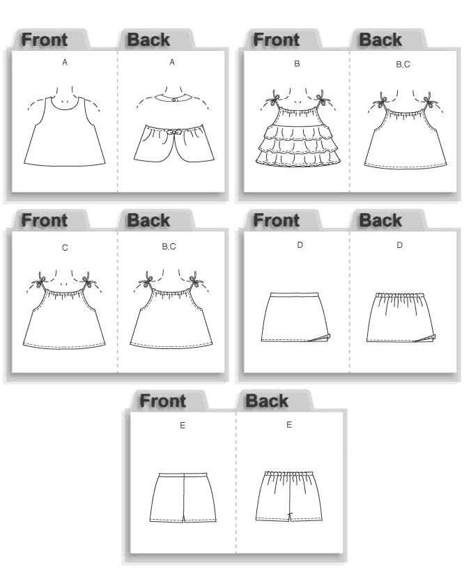 Oberteil A: Rückenknopfverschluss, Rückenausschnitt, Gummizug und Selbstschleife. B, C: Vorder- und Rückenteil mit Kordelzug. B: Rüschenvolants vorne. A-Linien-Skort D: Kurze Hose mit Rocküberschlag und Bund mit Gummizug hinten. Kurze Hose E: Bund mit Gummizug hinten.