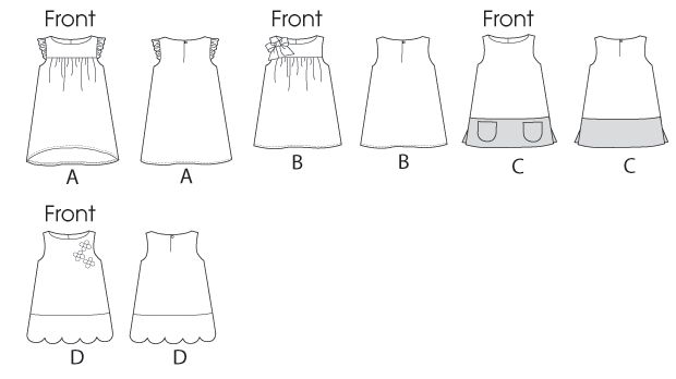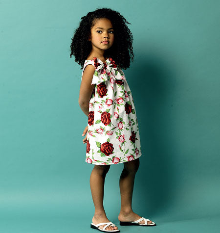 KLEID FÜR KLEINKINDER/KINDER: Pulloverkleid mit Schlitz im Nacken. A: schräge Armlochrüschen, geformter Saum, falsche Seite zeigt. B: selbsttragende Schleife. A und B: selbstgefütterte Passe, schmaler Saum. C: Taschen und Seitenschlitze. D: gekaufte Applikationen. C und D: Saumband und Knopf-/Fadenschlaufenverschluss hinten. Geeignet für leichte bis mittelschwere Webstoffe.
