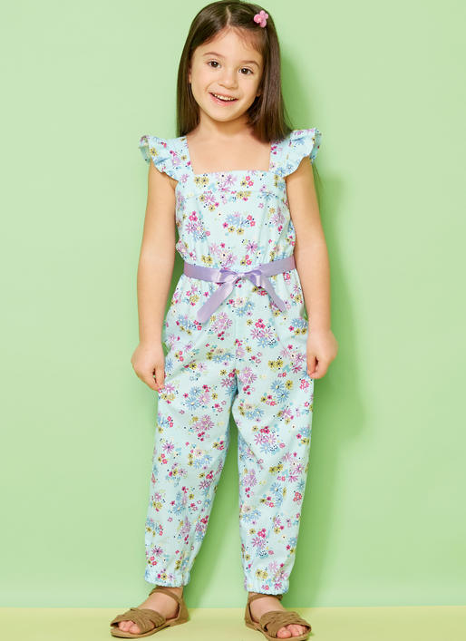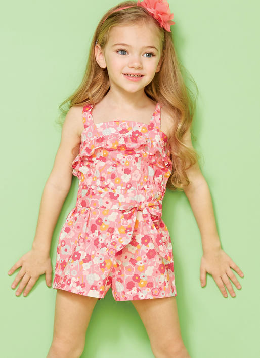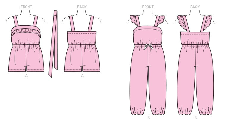 This cute girls' romper and jumpsuit have bodice with stitched front band, shoulder straps, waist casing and top edge of back is finished with elastic. Romper A has gathered ruffle at band, shorts length and fabric sash. Jumpsuit B has shoulder straps with gathered ruffles, full length pants with elastic casings at hem. Ribbon bow attached at waist.
