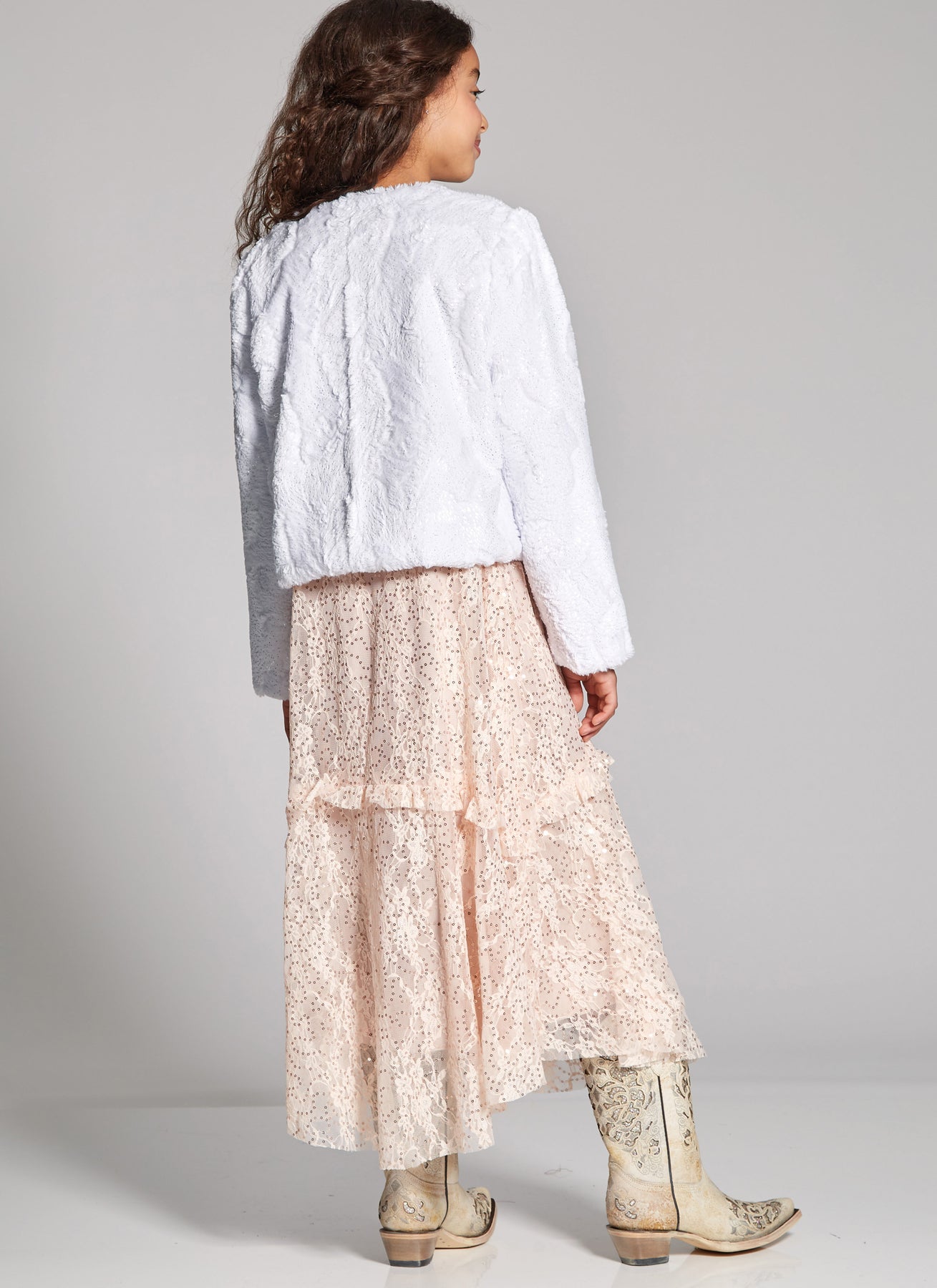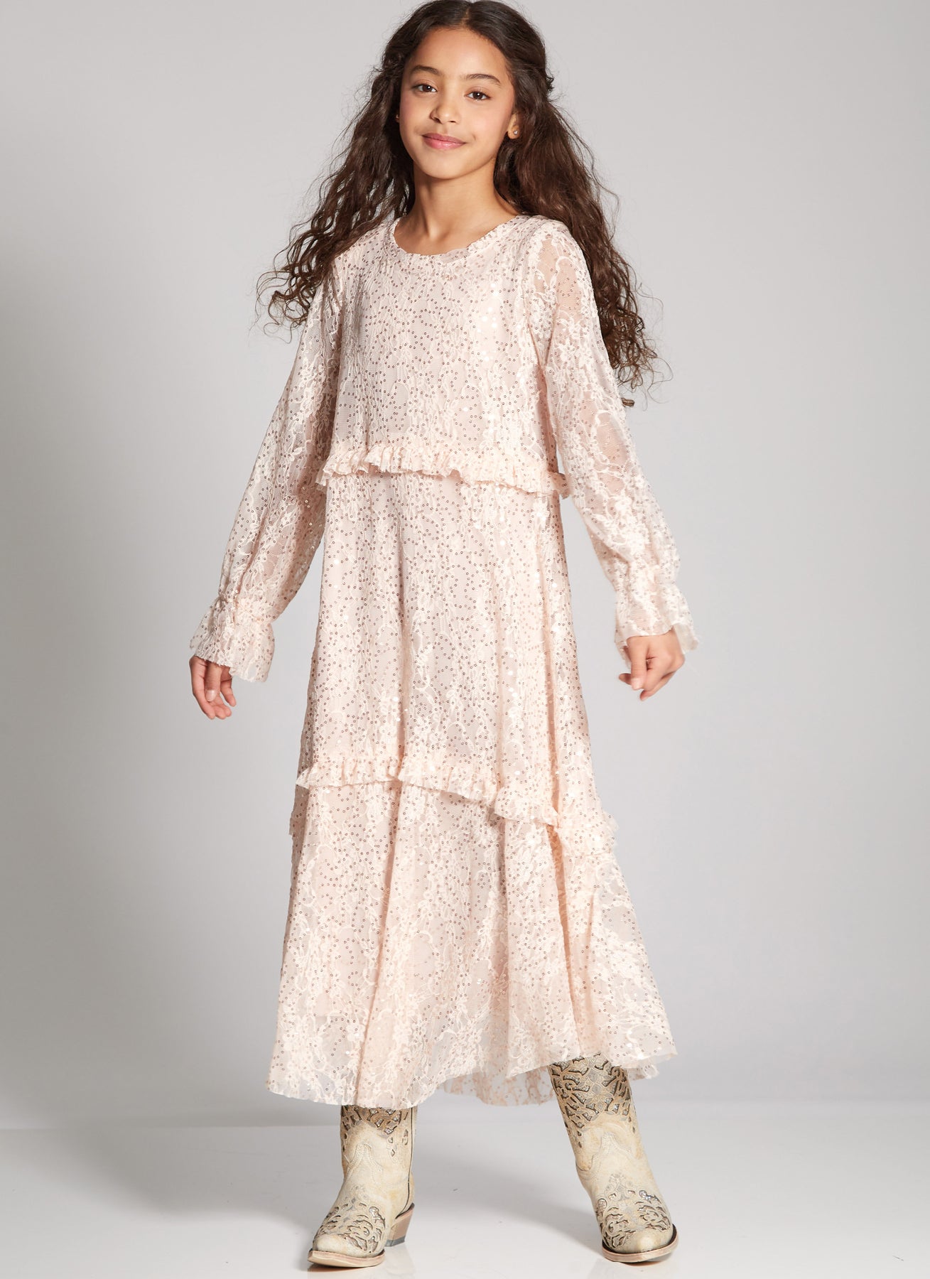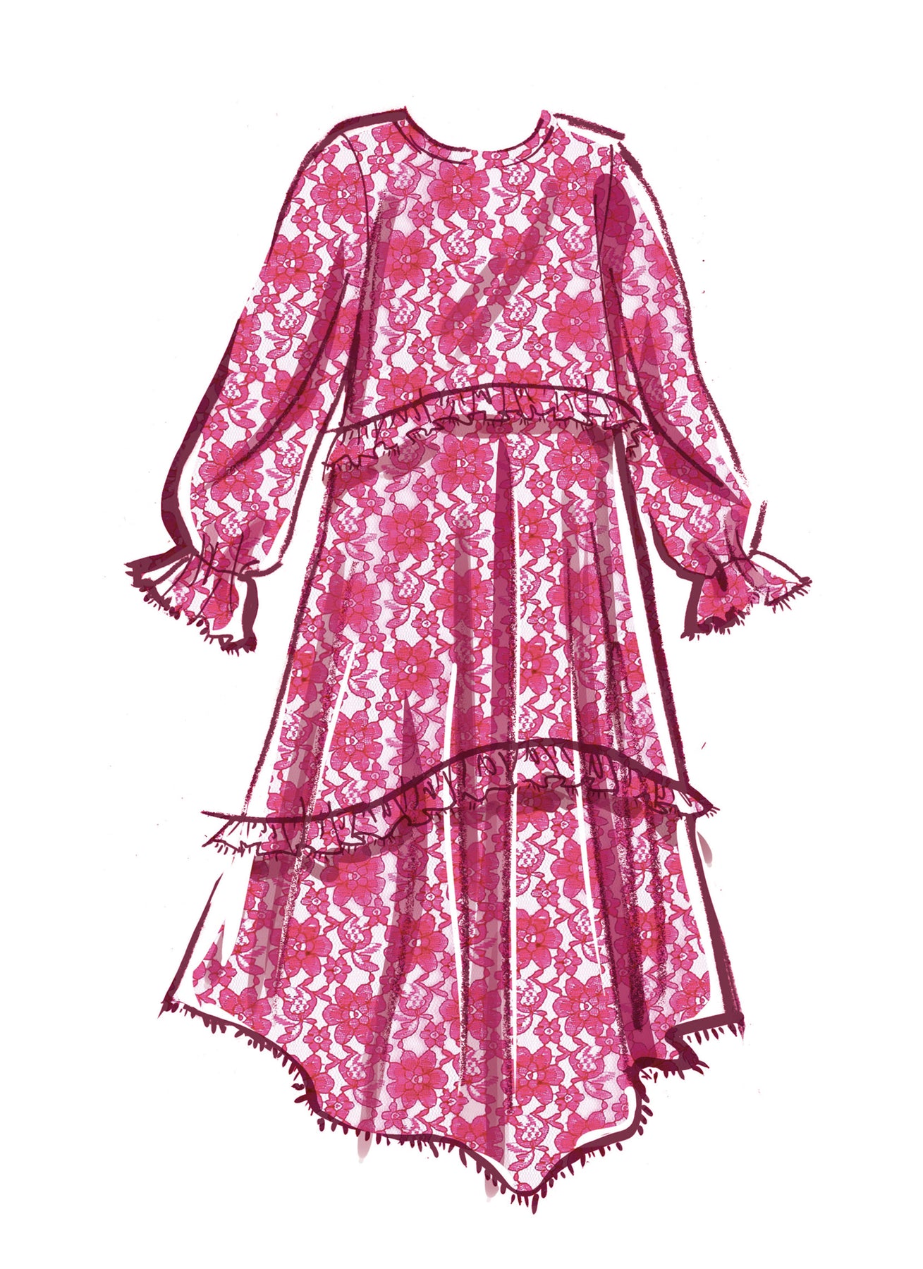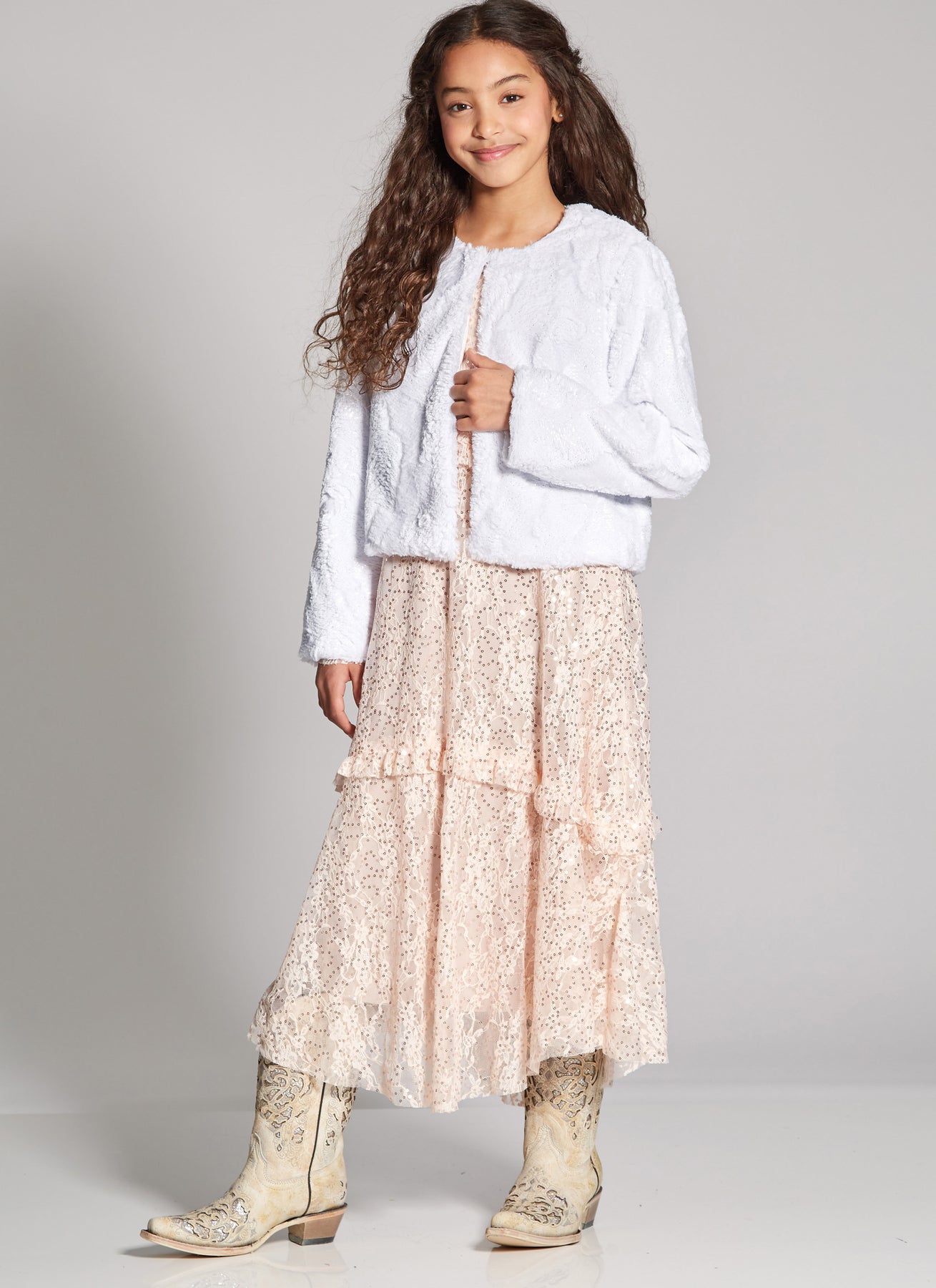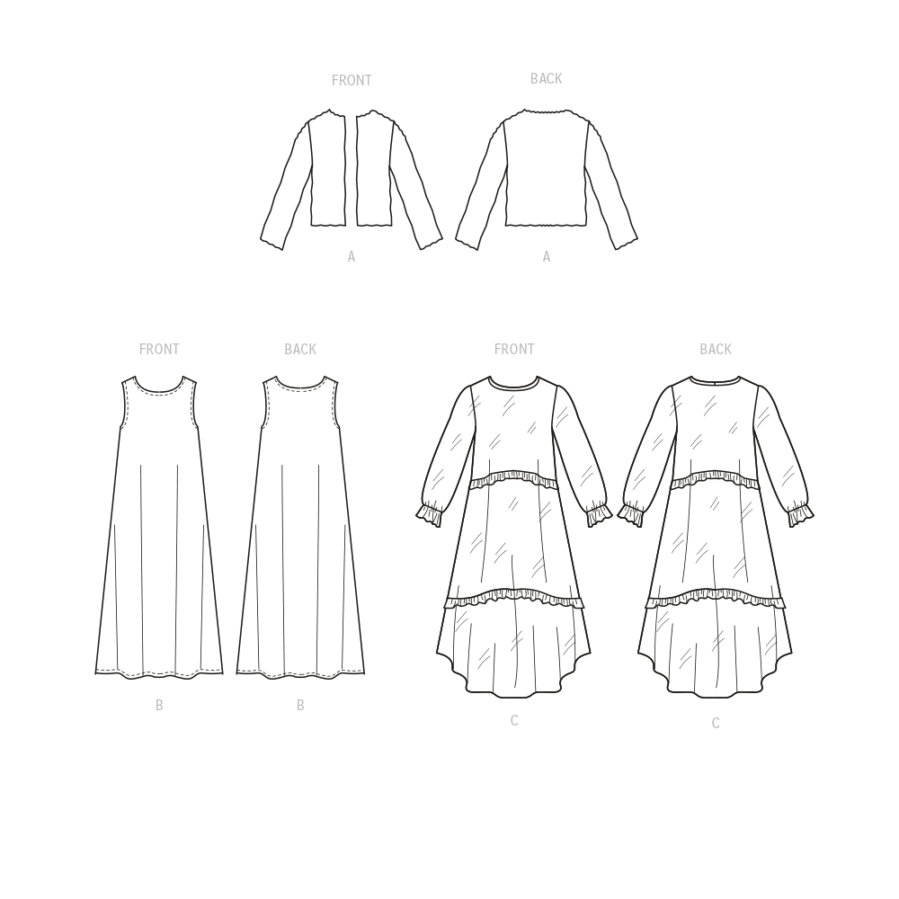 Die McCalls Schnittmuster M8354 bietet vielseitige Designs für Mädchen, die sowohl Stil als auch Komfort vereinen. Die Kunstpelzjacke besticht durch einen praktischen Pelzmantel-Hakenverschluss, der für einen sicheren Sitz sorgt und gleichzeitig modisch wirkt. Ansicht B zeigt ein elegantes Schlupfkleid mit schmalem Saum, ideal für festliche Anlässe oder den Alltag. Ansicht C überzeugt mit einem langärmeligen Kleid, das durch einen verspielten Rüschenbesatz und ein selbstklebendes Halsband besondere Akzente setzt. Der durchschnittliche Schwierigkeitsgrad macht dieses Schnittmuster perfekt für Näherinnen mit etwas Erfahrung, die kreative und ansprechende Kleidungsstücke für Mädchen gestalten möchten.
