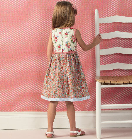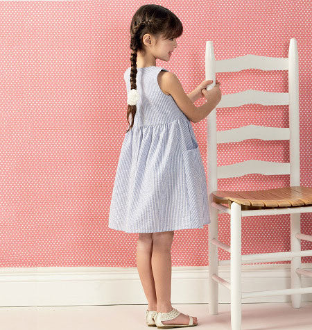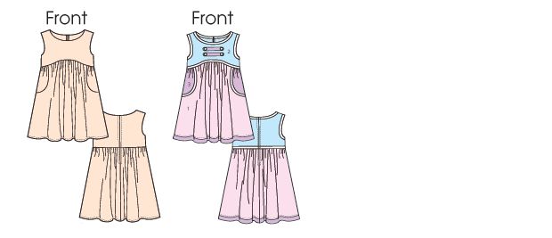 These easy, breezy dresses are perfect for Spring and Summer. Sleeveless with self-faced bodices, these dresses have gathered skirts, shaped pockets and back zipper closure. View A is plain and simple with a stitched hem. View B jazzes it up adding front tabs with buttons and purchased double fold bias tape at the neckline, armhole, pocket edges and along waist seam. Coordinating fabrics: one for the bodice, one for the pockets, tabs and lower band and one for the skirt add extra pizzazz. Designed for lightweight woven fabrics such as cotton, cotton types, calicos, chambray, linen.