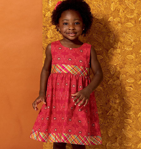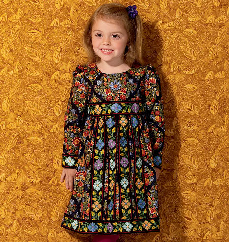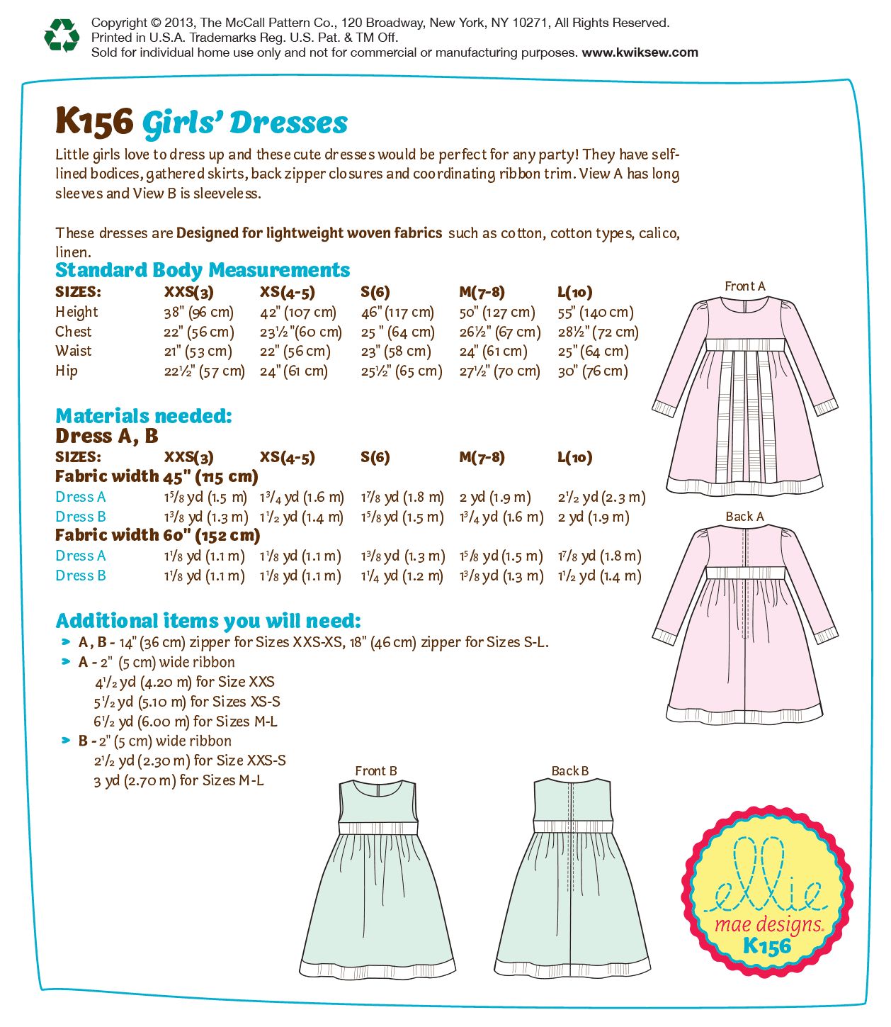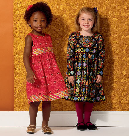 Little girls love to dress up and these cute dresses would be perfect for any party! They have self-lined bodices, gathered skirts, back zipper closures and coordinating ribbon trim. View A has long sleeves and View B is sleeveless.