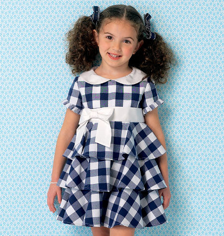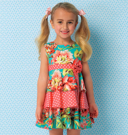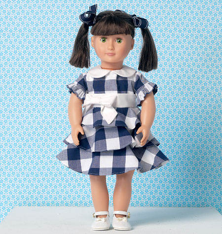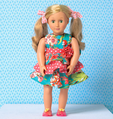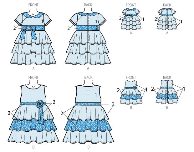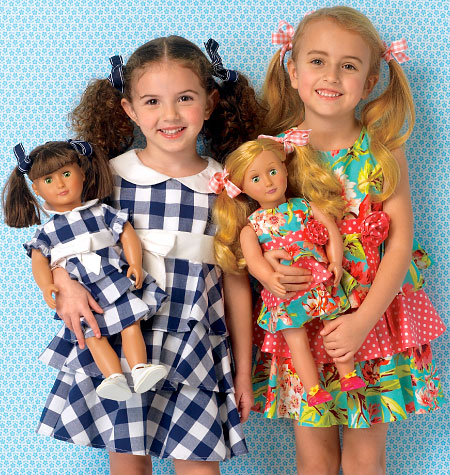 A little girl and her doll would be the toast of the party in their matching outfits. Dresses are made up with two fabric choices and include matching dresses for 18" (45 cm) doll. Have fun matching prints or coordinating solids. Dresses have lined bodice, contrast waistbands, tiered skirts and back zipper closure. Dress A has contrast collar and bow, short sleeves with self faced ruffles. Dress B is sleeveless, with contrast tier and flower with streamer.