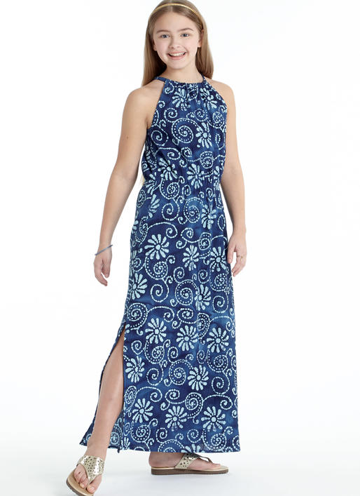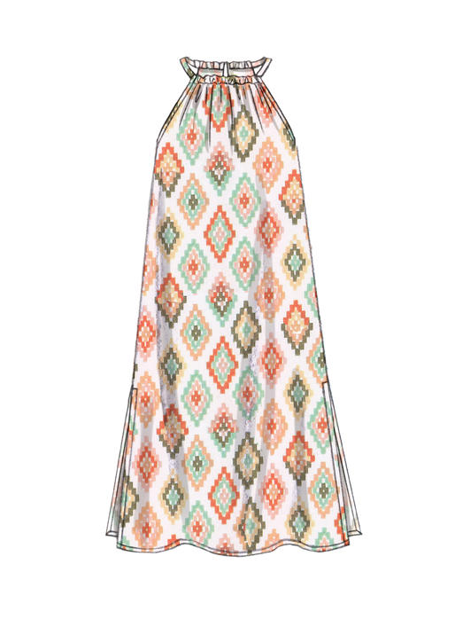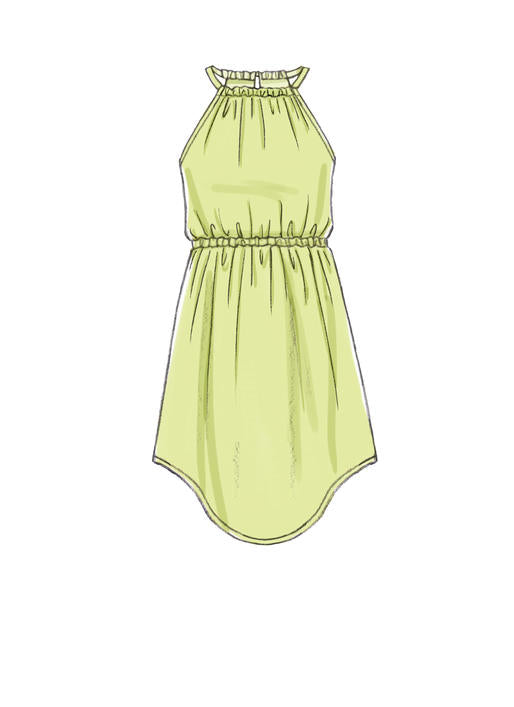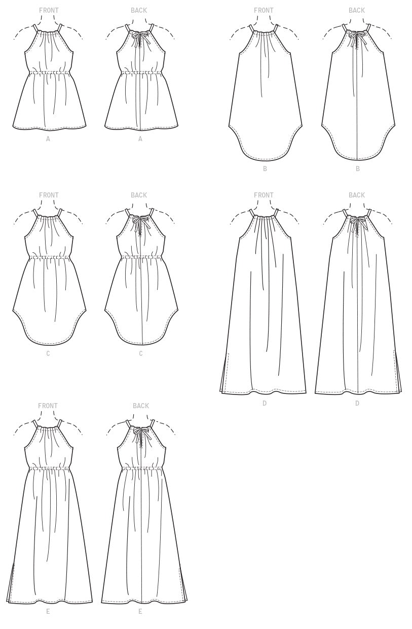 Locker sitzende, ärmellose Pulloverkleider mit gerafftem Halsausschnitt, Nackenschlitz und Saumvariationen. A, C, E: Gummizug in der Taille.
