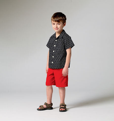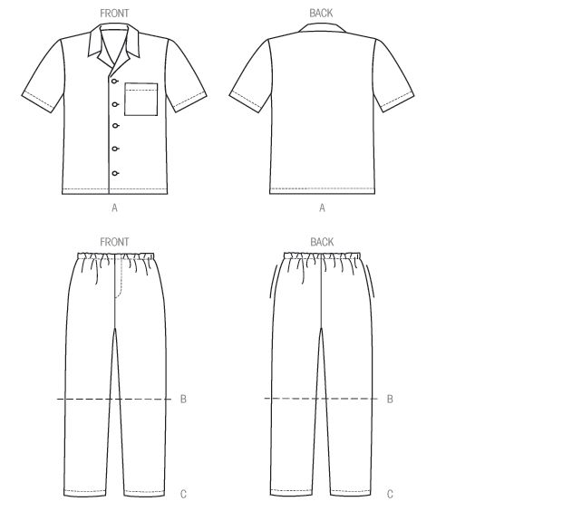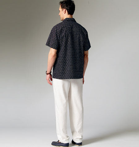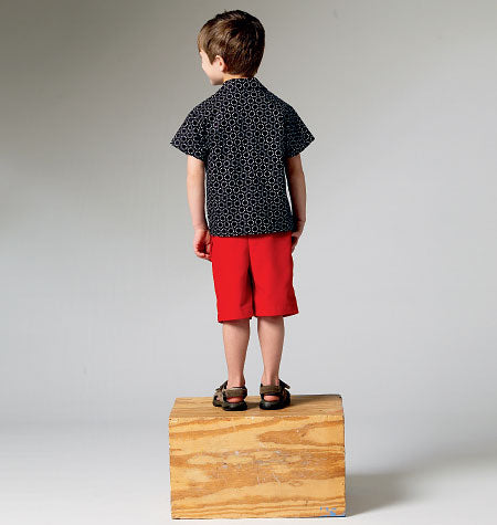 SHIRT, SHORTS UND PANTS FÜR HERREN/JUNGEN: Hemd mit Kragen, Tasche und Knopfverschluss vorne. Shorts und Hosen mit geradem Bein haben einen elastischen Bund, einen Hosenschlitz und Seitentaschen. Alle sind locker geschnitten und haben genähte Säume.