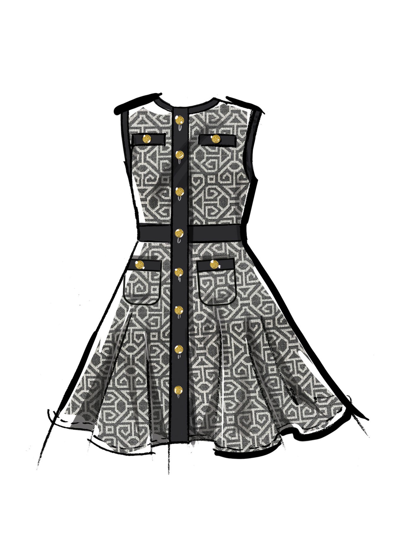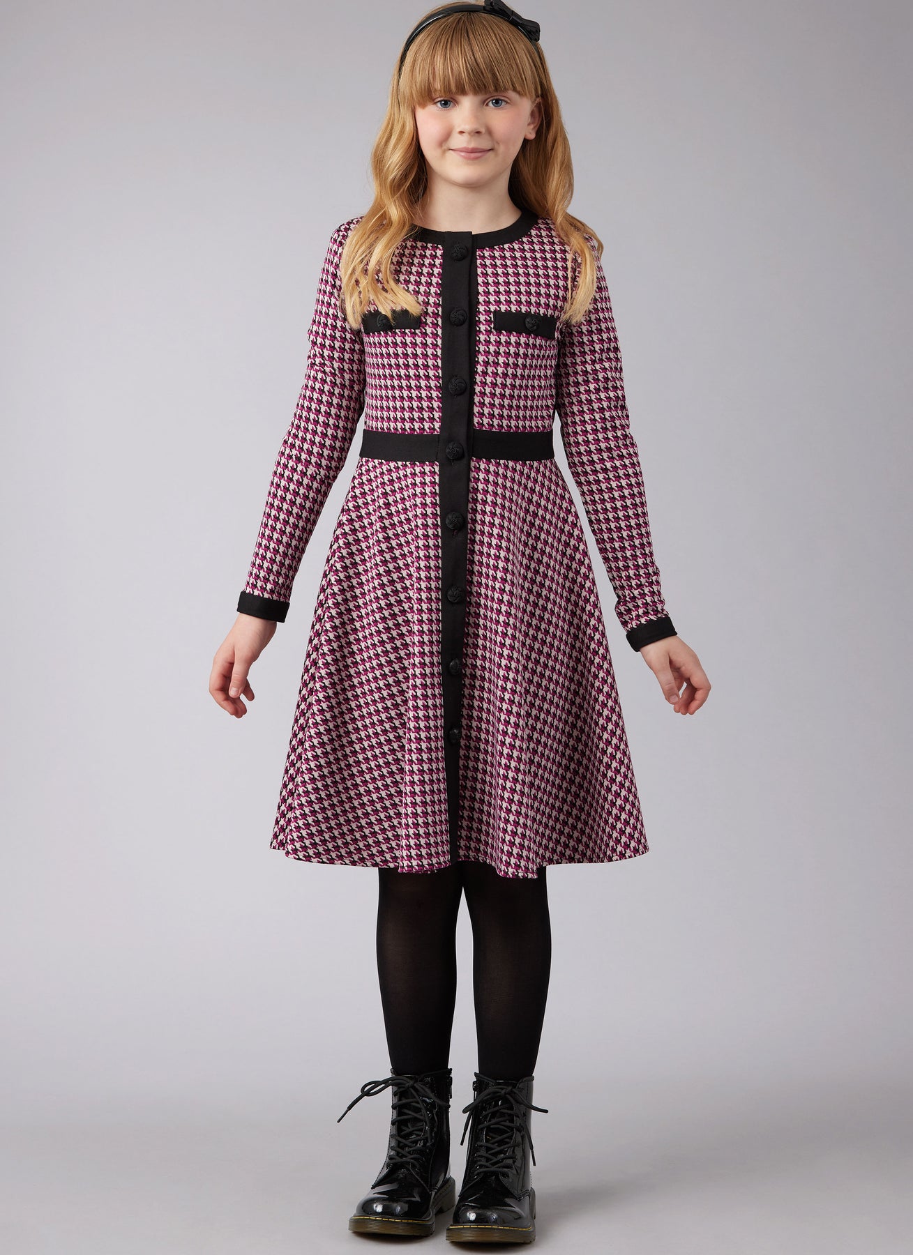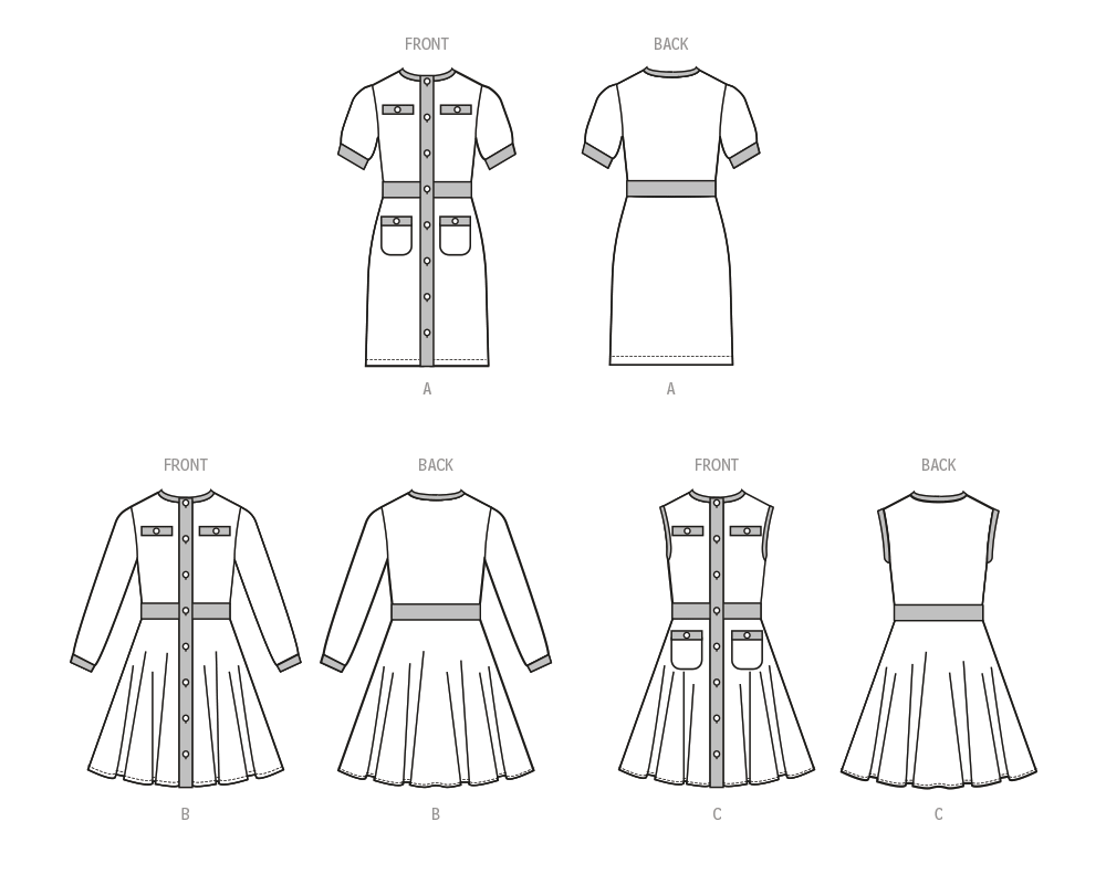 Kreieren Sie diese einfach zu nähenden Mädchenkleider in den Größen 7-14. Die Strickkleider mit Ärmelvariationen haben einen Rundhalsausschnitt, Kontrastbänder, eine Zierleiste mit Knopfleiste und optionale Taschen vorne. Die Ansichten B und C haben einen ausgestellten Rock mit schmalem Saum.