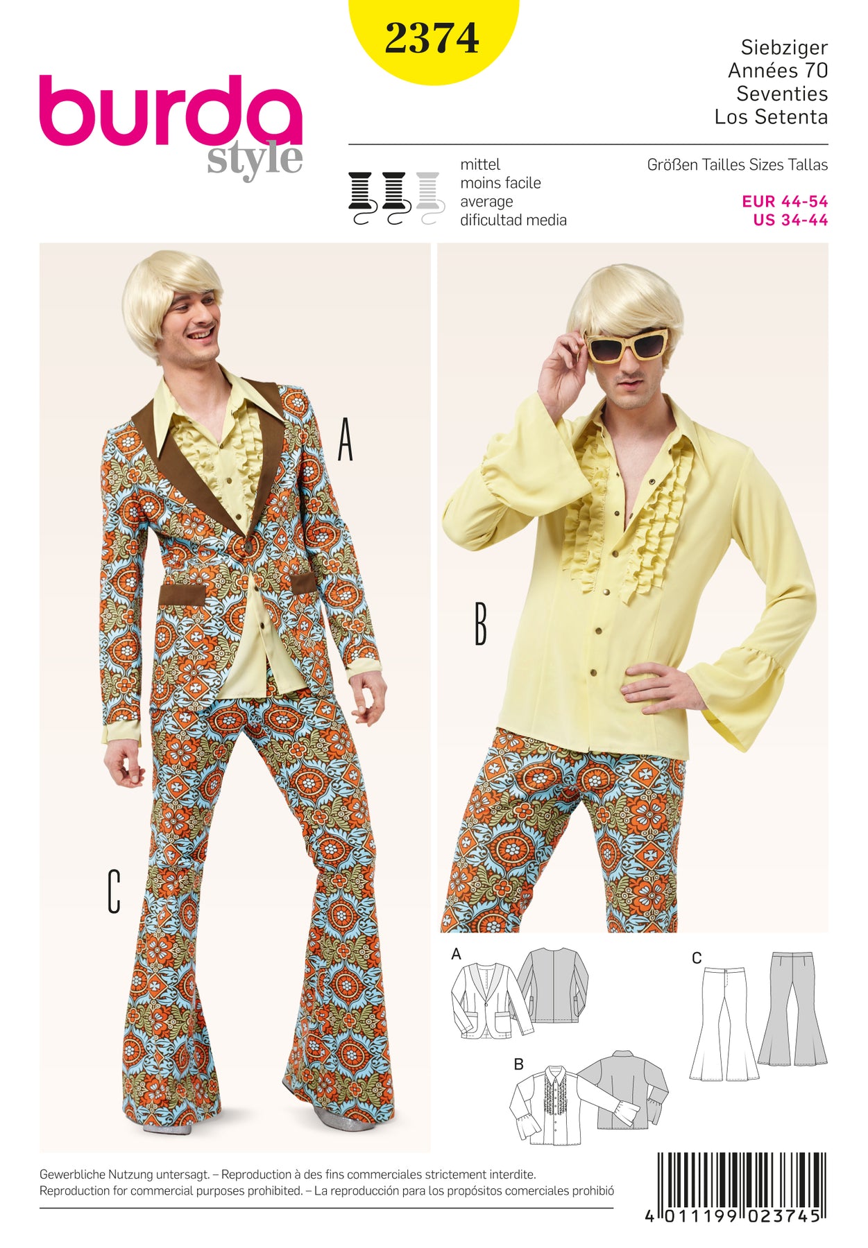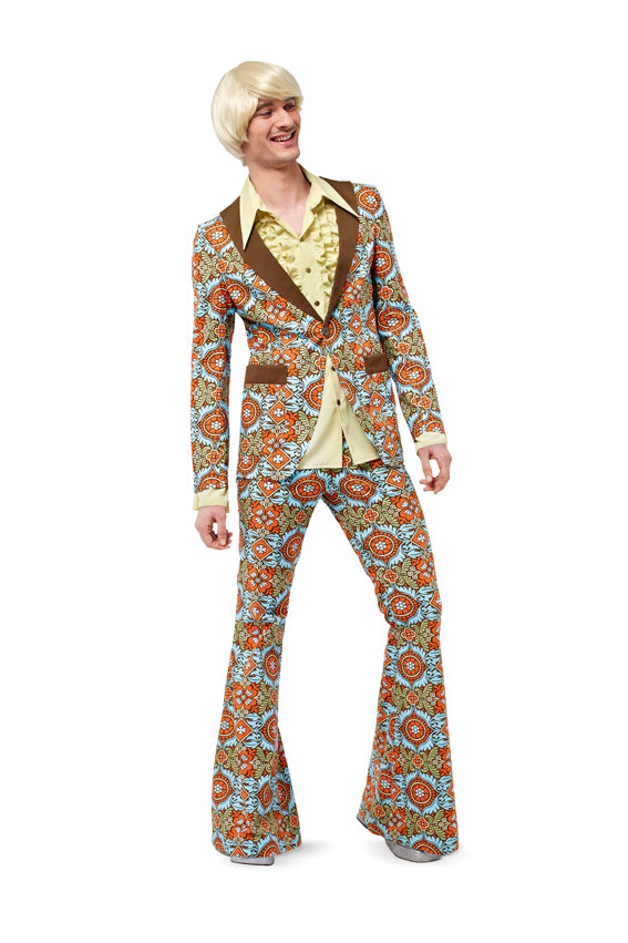 70er Partyanzug - Herren Jacke - Hemd - Schlaghose Schwierigkeitsgrad: mittel Gr. 44, 46, 48, 50, 52, 54 70er-Jahre, ein beliebtes Motto für Partys, nicht nur an Fasching. Hier das perfekte Outfit für den Herren, bestehend aus Sakko, Rüschenhemd und Schlaghose. Mit plakativen Farben und Mustern ein echter Hingucker.