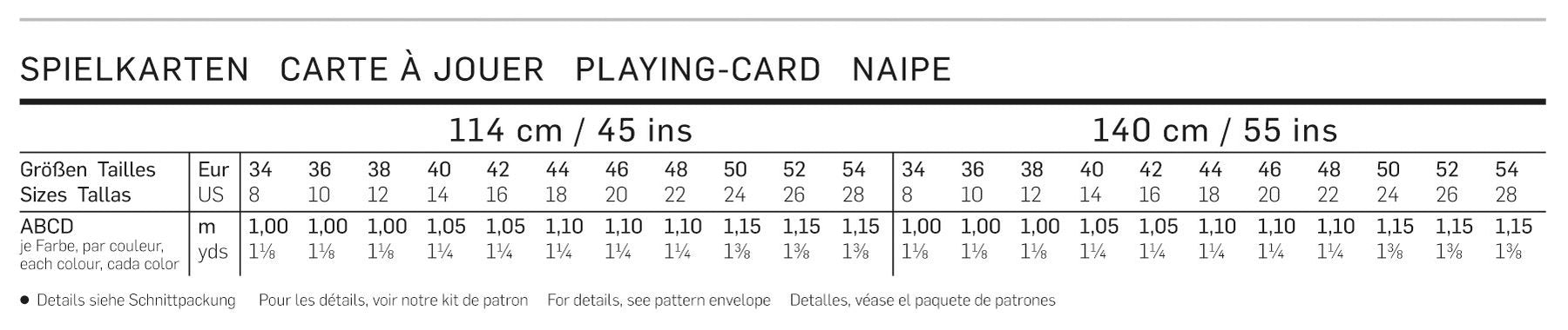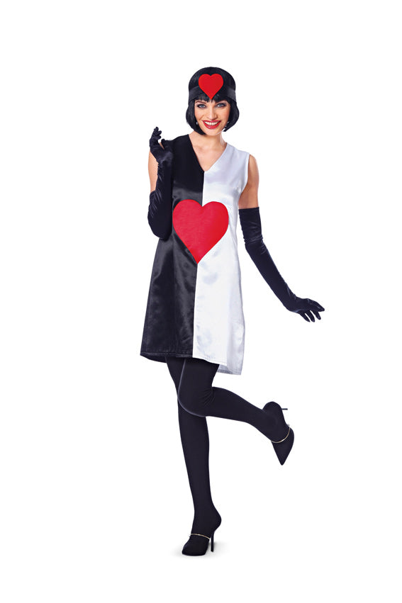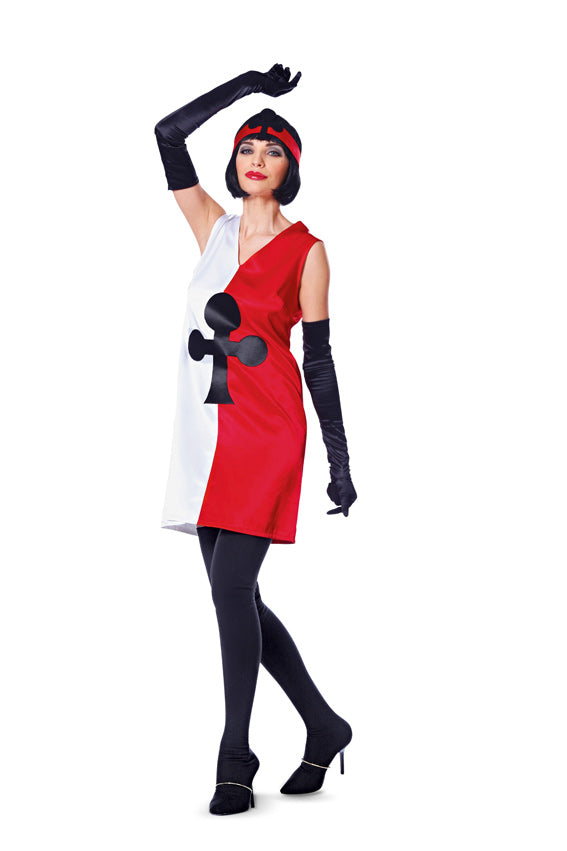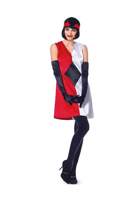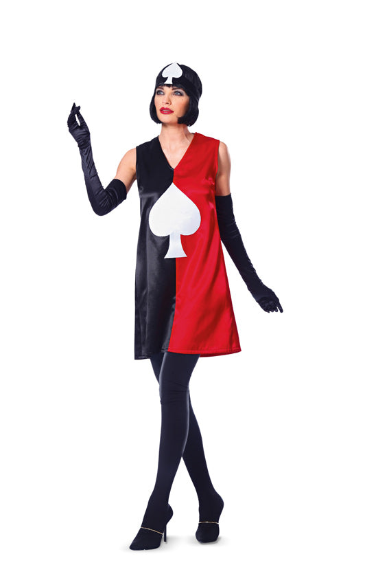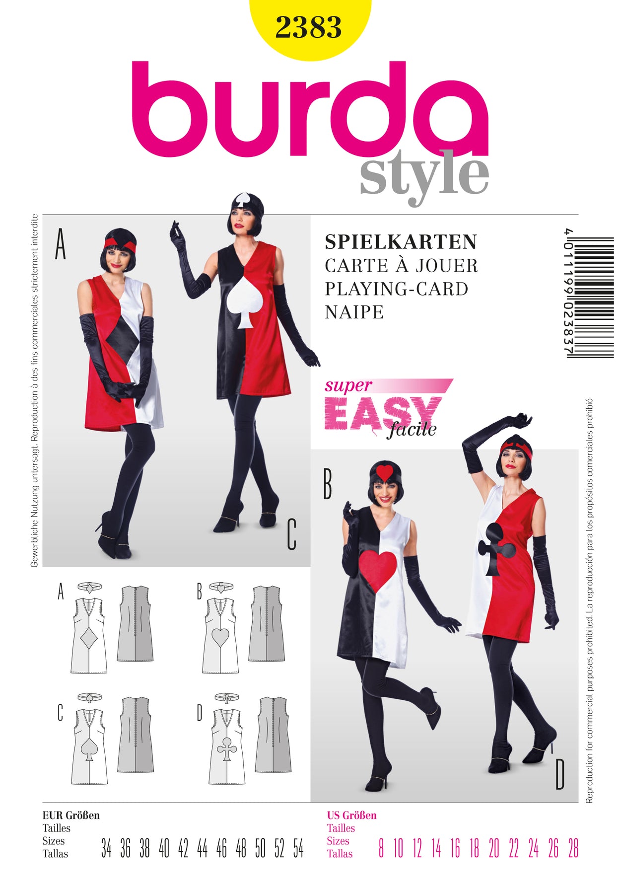 Das ärmellose Kleid mit V-Ausschnitt ist schnell aus zwei Stoffen genäht und mit dem Spielkartenmotiv - Herz, Karo, Pik oder Kreuz - verziert. Darauf abgestimmt das Stirnband, das mit Klettband geschlossen wird.