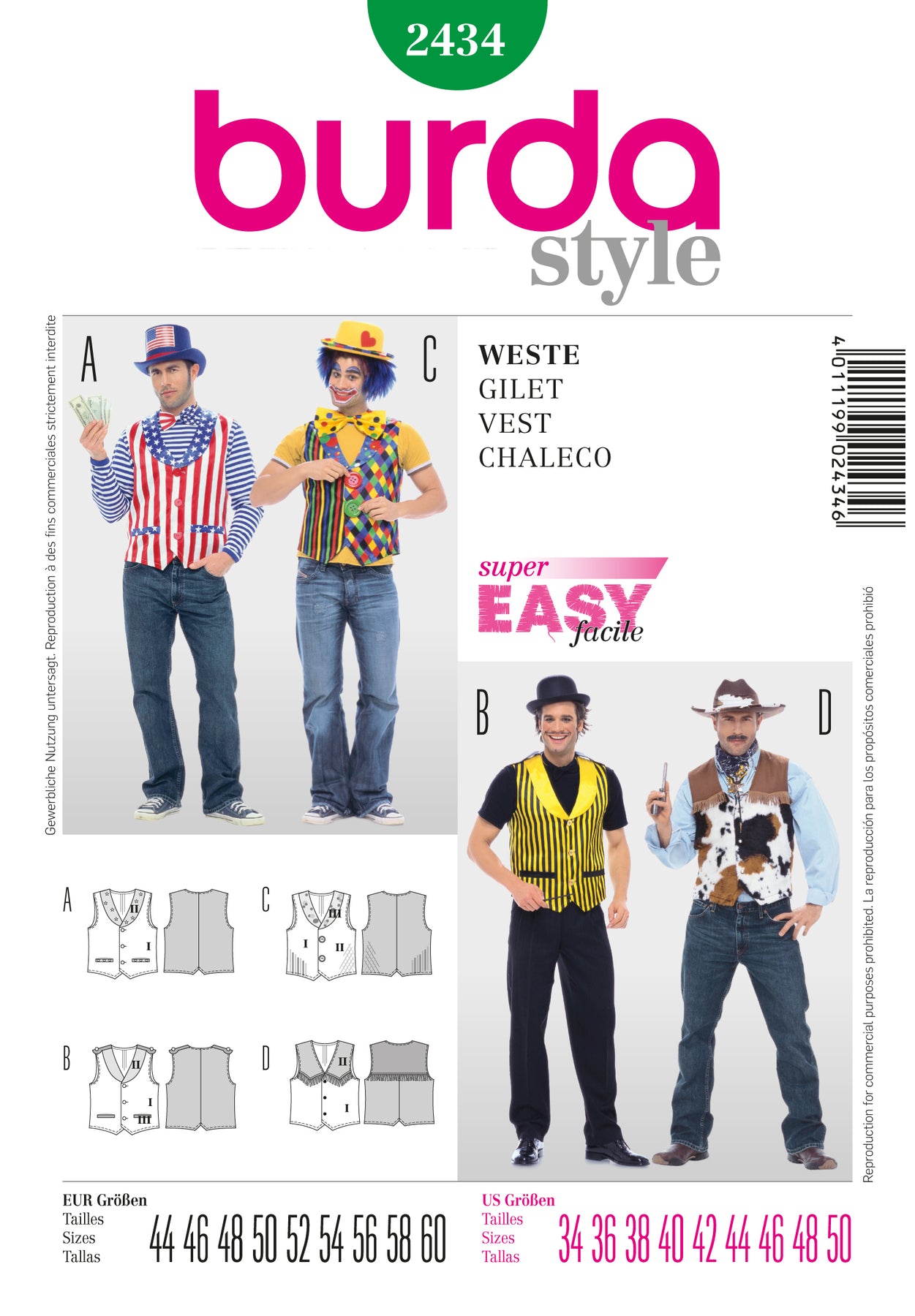Weste, normal weit, einfacher Grundschnitt für viele Faschingsthemen. Vom Cowboy bis zum Clown, vom Barmann bis zum Zauberer. Lassen Sie sich inspirieren. Mit passendem Hut und etwas Schminke ist die Verwandlung perfekt.