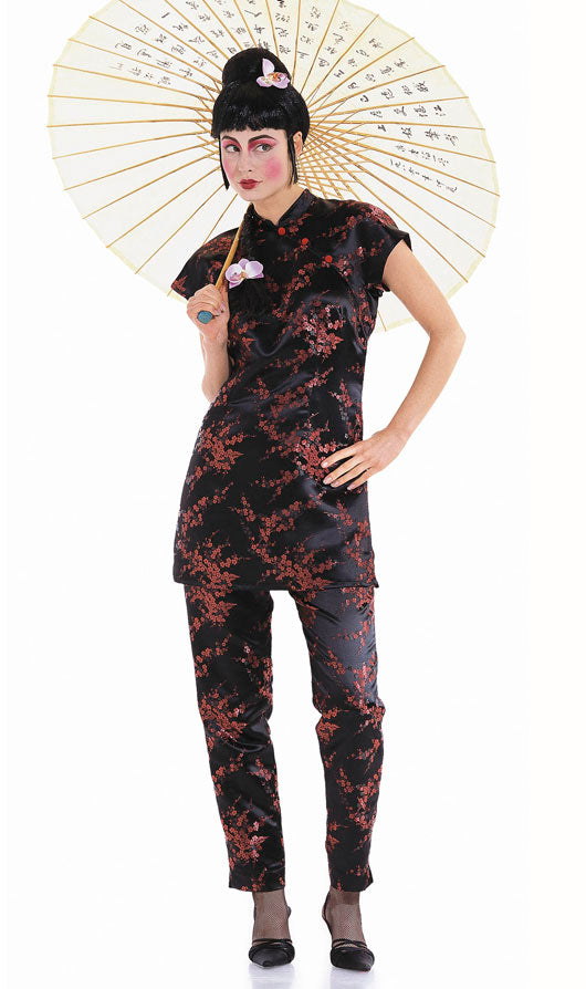 Ob als langes, geschlitztes Kleid A oder als 2-Teiler B mit schmaler, geschlitzter Hose. Dieses Kostüm garantiert Ihnen einen glanzvollen Auftritt im Asia-Look.