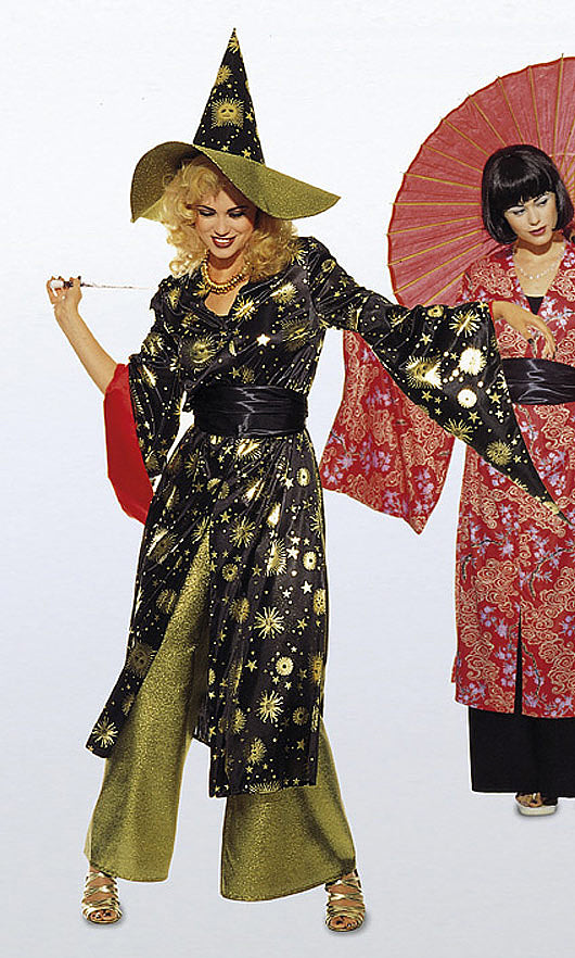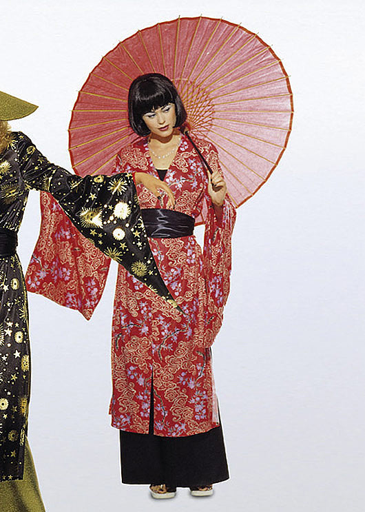 Kimono, normal weit, mit Klettverschluss und zwei Ärmelvariationen, dazu sehr weite Gummizughose mit Nahttaschen und Schärpengürtel.