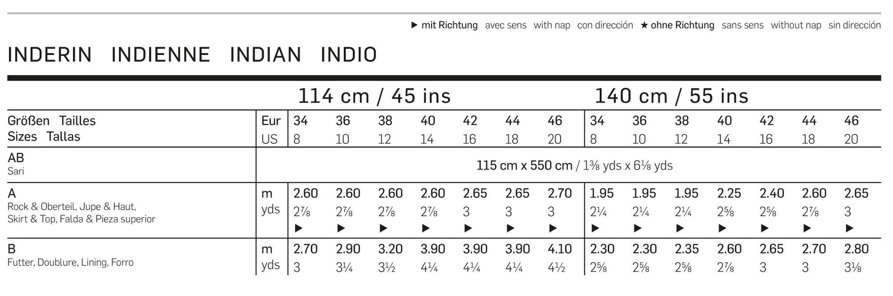 Bei Modell A binden Sie den Sari auf traditionelle Art über Rock und Top aus Dupionseide. Das märchenhafte Outfit B, bestehend aus Tunika und schmaler Hose, beide gefüttert sowie Schal wird direkt aus einem Sari zugeschnitten und geschneidert. Bei beiden kommen die eingewebten Bordüren schön zur Geltung