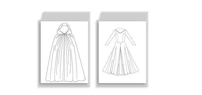 Samt, Velours, Krepp und stabile Strickwaren. Cape-Futter: Satin und Jaquard. Kleid-Futter: Gefütterte Stoffe. Nicht geeignet für offensichtliche Diagonalen oder ungleichmäßige Karos.