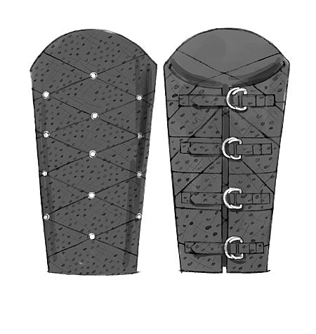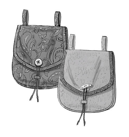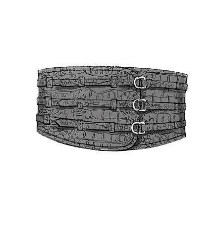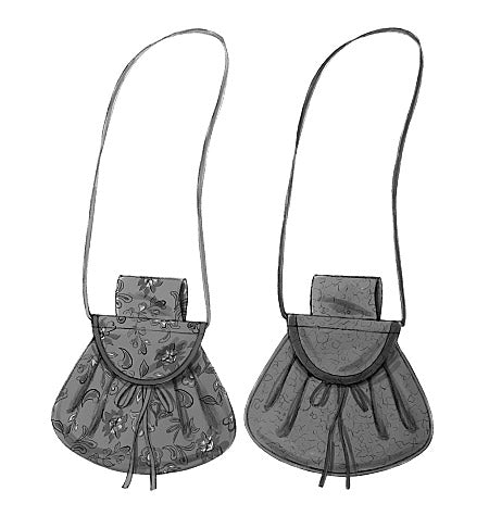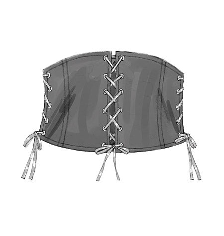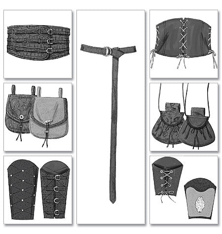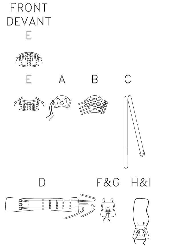 Das Paket enthält Schnittmuster und Anleitungen für Handgelenkstütze A: 6", Kontrastpatch, Schnürverschluss. Handgelenkstütze B: 8½", Schnallenverschlüsse. Gürtel C. Korsett D: Schnallenverschlüsse. Korsett E: Geschnürter Verschluss. Gürteltaschen F, G: 6" x 7". Beuteltasche H, I: 9" x 7". G, H, I: Kontrastierender Einband.