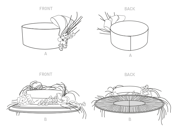 Der kleinere Hut von 1880 wird durch den breiten Hut von 1910 kontrastiert. Beide Hüte werden über der Frisur getragen und mit Bändern, Blumen und Federn verziert.
