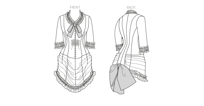 A pretty 1881 miss top pairs with the 1881 skirt, M8191. This afternoon visiting or walking ensemble is worn while paying calls on friends & neighbors. It should be made of practical fabrics in shades of navy, brown or dark green to conceal dust, soot or mud. The self-fabric ruched trim is at the collar, elbows & hemline. Bows of contrast fabric are at the neckline & back. The top has formfitting seams, opens down the front & is underlined with cotton.