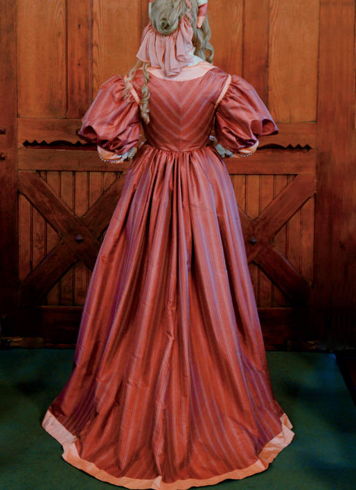 Historisches Kleid mit Schnürung an der Brust. Edel und zugleich verspielt mit verschiedenen Applikationen. Die breiten Hüften werden mit einem speziellen Unterrock gestützt.