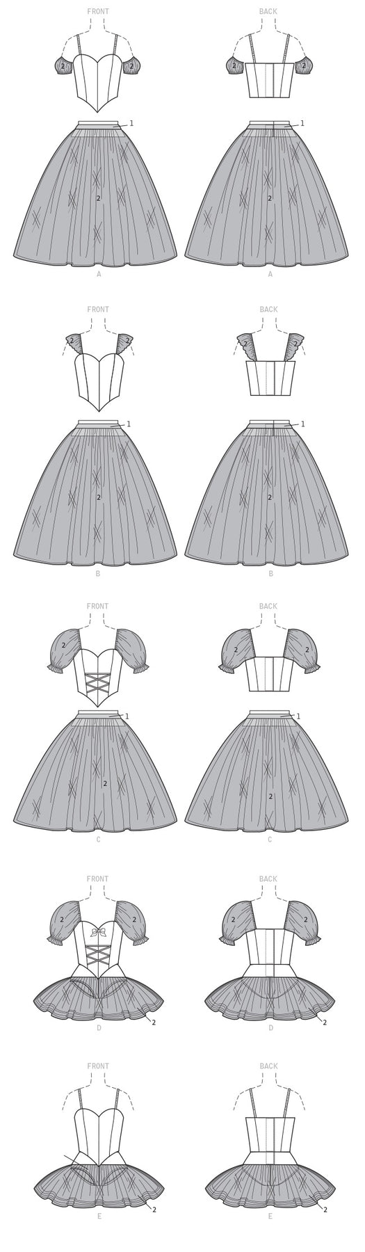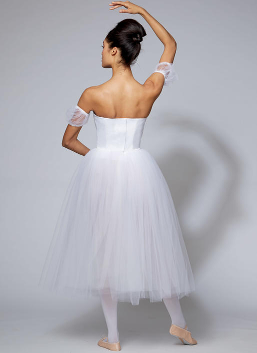 Ballettkostüme haben ein tailliertes, unterfüttertes Mieder mit Klettverschluss am Rückenverschluss. Die Ansichten A, B und C haben geraffte Röcke mit Längenvariationen. Die Ansichten D und E haben untere Passe, geraffte Röcke und angesetzte Höschen mit Gummizug in den Beinausschnitten. Ansicht A: elastische Schulterträger und Ärmel mit Gummizug in den Hüllen. Ansicht B: geraffte Ärmel mit Gummizug im Schulterbereich. Ansicht C: Ärmel mit Gummizug im Schulter- und Unterarmbereich und gekauftem Kordelband. Ansicht D: Ärmel mit Gummizug im Schulter- und Unterarmbereich, Bandschleife und gekaufter Kordelborte. Ansicht E: elastische Schulterriemen.