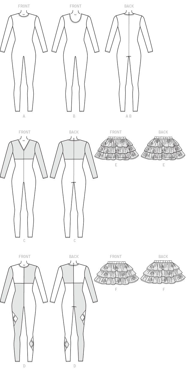 Eng anliegende, langärmelige Bodys haben einen variablen Halsausschnitt, einen unsichtbaren Reißverschluss am Rücken und einen schmalen Saum. A: Gekauftes optionales Grünzeug. A, D: Runder Halsausschnitt. B: Rundhalsausschnitt. C: V-Ausschnitt. C, D: Kontrastfarbige Einsätze. D: Rautenförmige Applikationen. Die Röcke haben einen elastischen Taillenbund und aufgesetzte Rüschen mit rohem Saumabschluss. A, B, C, D: Nur Zwei-Wege- und Vier-Wege-Stretch-Strick.