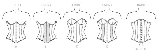 Sehr eng anliegende, unterfütterte, mit Einlagen versehene, gefütterte, entbeinte Korsetts mit Bügeln, Nahtdetails, geformtem vorderen Saum und Rückenverlängerung/Schnürung. Gekaufte Schrägbandverarbeitung. C, D: BH mit Frontnaht. Hinweis: Für die Körbchengrößen A/B, C, D sind separate Schnittteile enthalten. Enthält separate Schnittteile für die Körbchengrößen A/B, C und D.