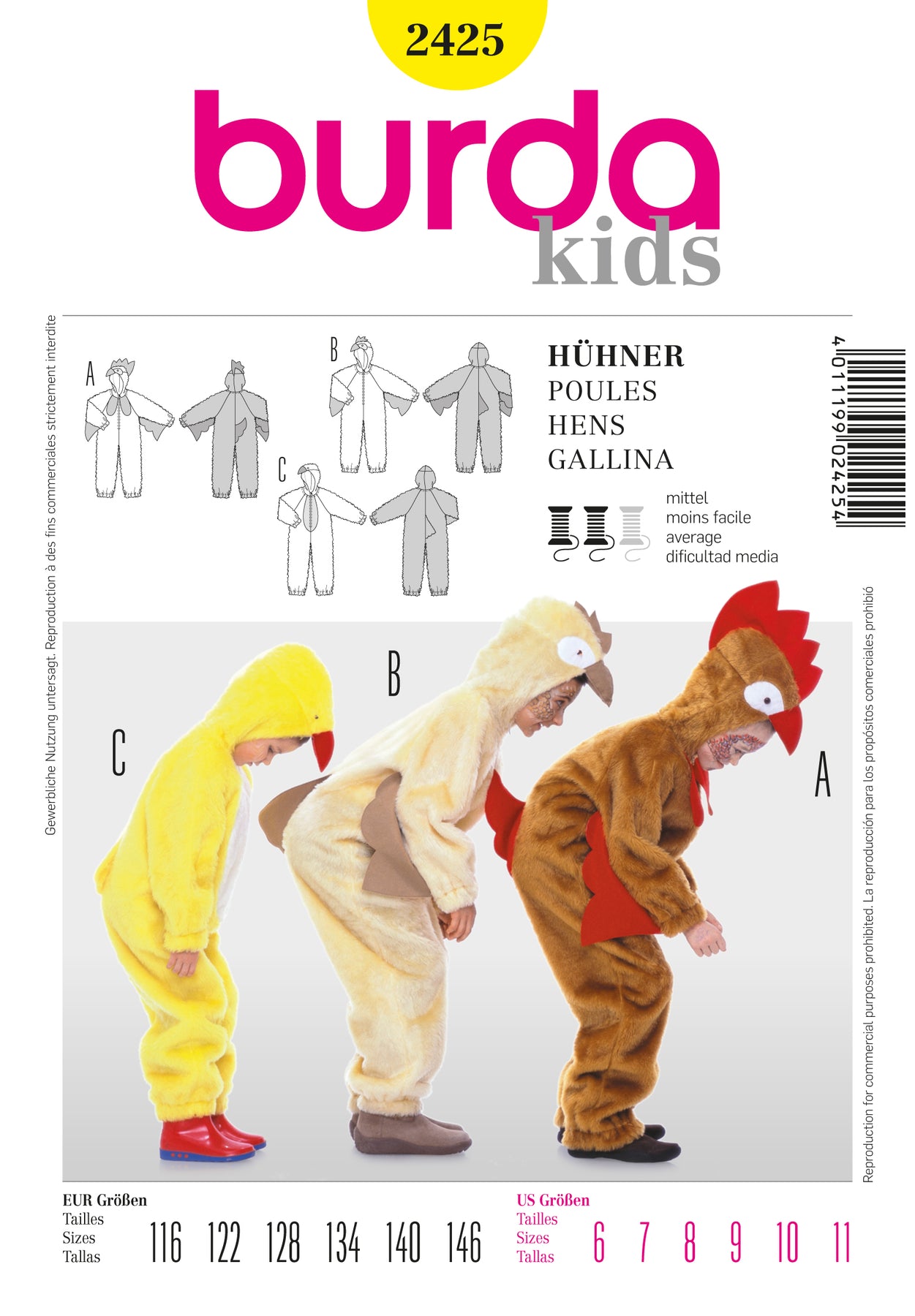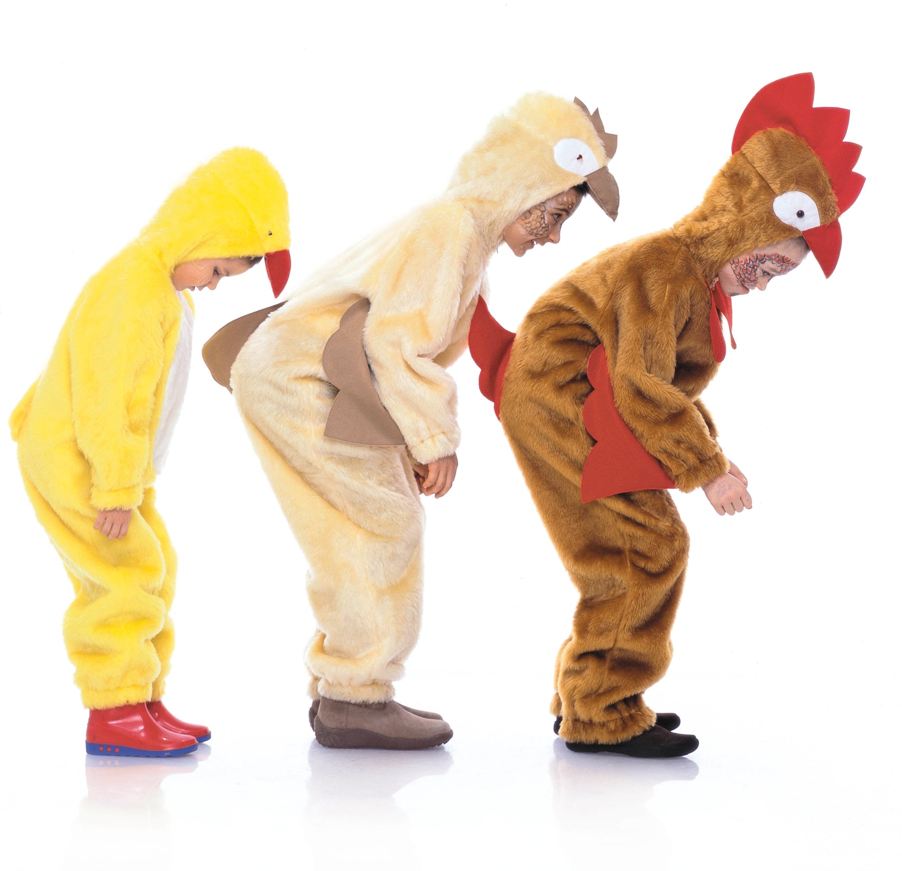 Da kommt die lustige Hühnerparade! Sie haben die Wahl: Hahn A, Huhn B oder Küken C. Die Overalls sind bequem weit, da passt auch noch ein warmer Pulli drunter. Schnabel und oberes Kapuzenteil werden ausgestopft.