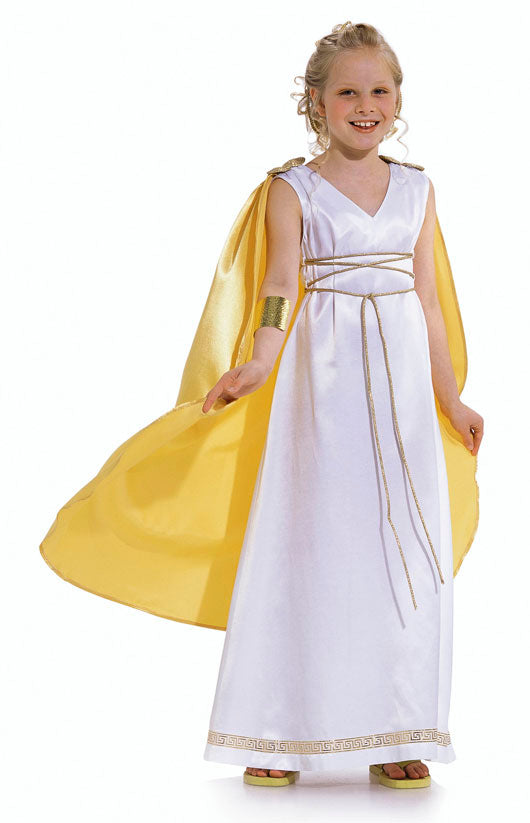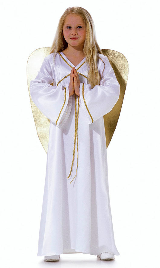 AB normal weit. Ärmelloses Kleid mit Schnürung für die Römerin A. Das Cape wird einfach an der Schulter festgesteppt. Kleid B für den Engel, mit langen, ausgestellten Ärmeln, ist mit Goldborte verziert. Die Flügel sind mit Klettband am Rückenteil befestigt und können abgenommen werden.
