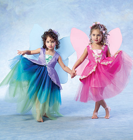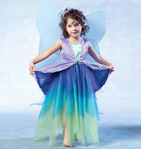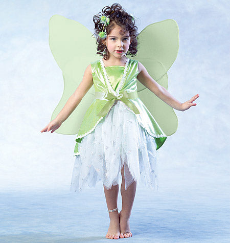 Süßes Elfenkostüm für Kinder in 3 Variationen. Das Pulloverkleid hat Schulterträger und einen abgesteppten Saum. Gefütterte Weste mit Taillennaht, Haken- und Ösenverschluss vorne, gekauftem Besatz und Klettverschluss hinten zum Befestigen von Flügeln. B, C: Gürtel mit Schleife. Die Flügel sind durchsichtig mit Draht, der in die Hüllen eingefügt ist, um die Form zu erhalten. Mehrlagiger Rock, bis zur Mitte des Knies oder in voller Länge, mit Gummizug in der Taille und unbearbeiteten Säumen. C, D: Geformte Saumabschlüsse.