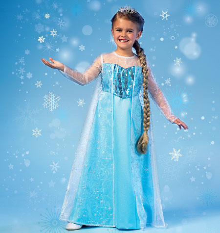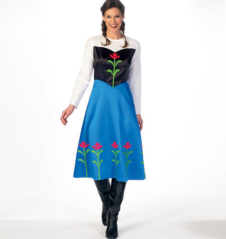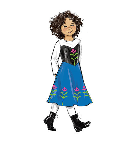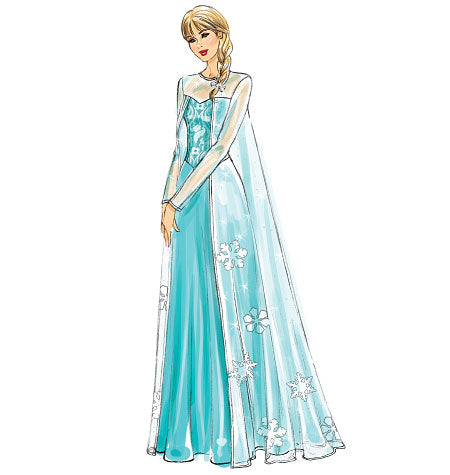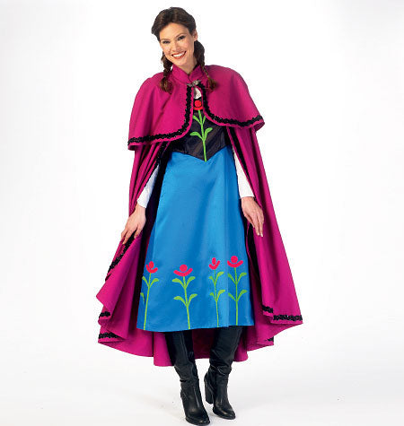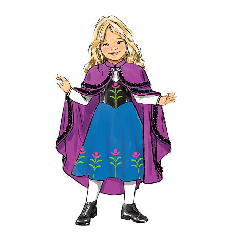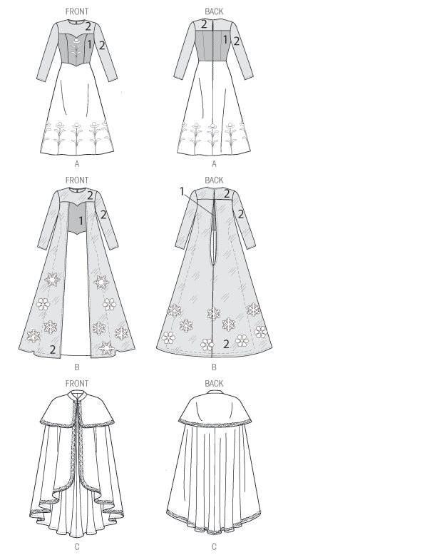 Kleider mit schrägem Halsausschnitt, Passe, gefüttertem Oberteil mit Prinzessnähten, Rückenreißverschluss und Applikationen, optional für Overlay B. Ärmel und Overlay B: schmaler Saum. Gefütterter Umhang mit Kragen und Capelet. Gekaufte Borte und dekorativer Verschluss.