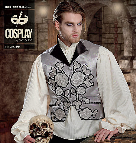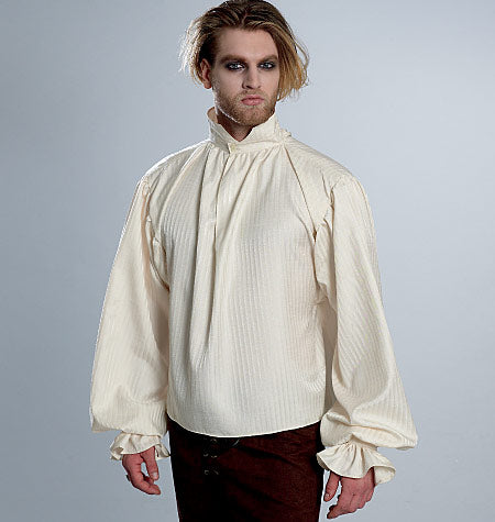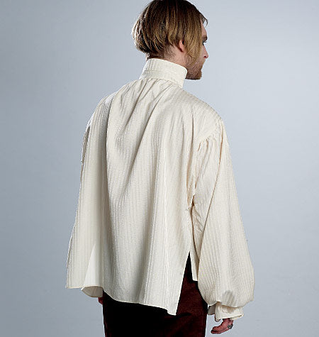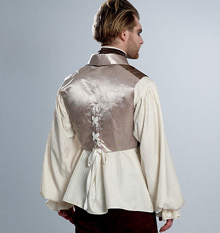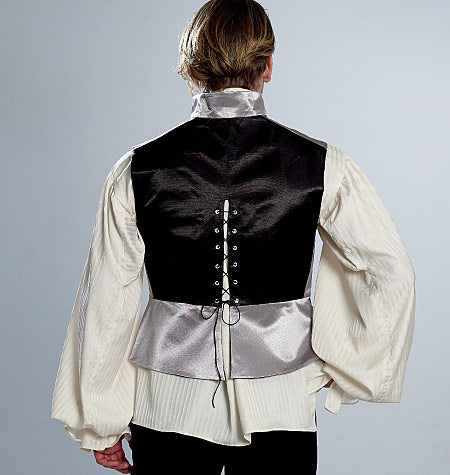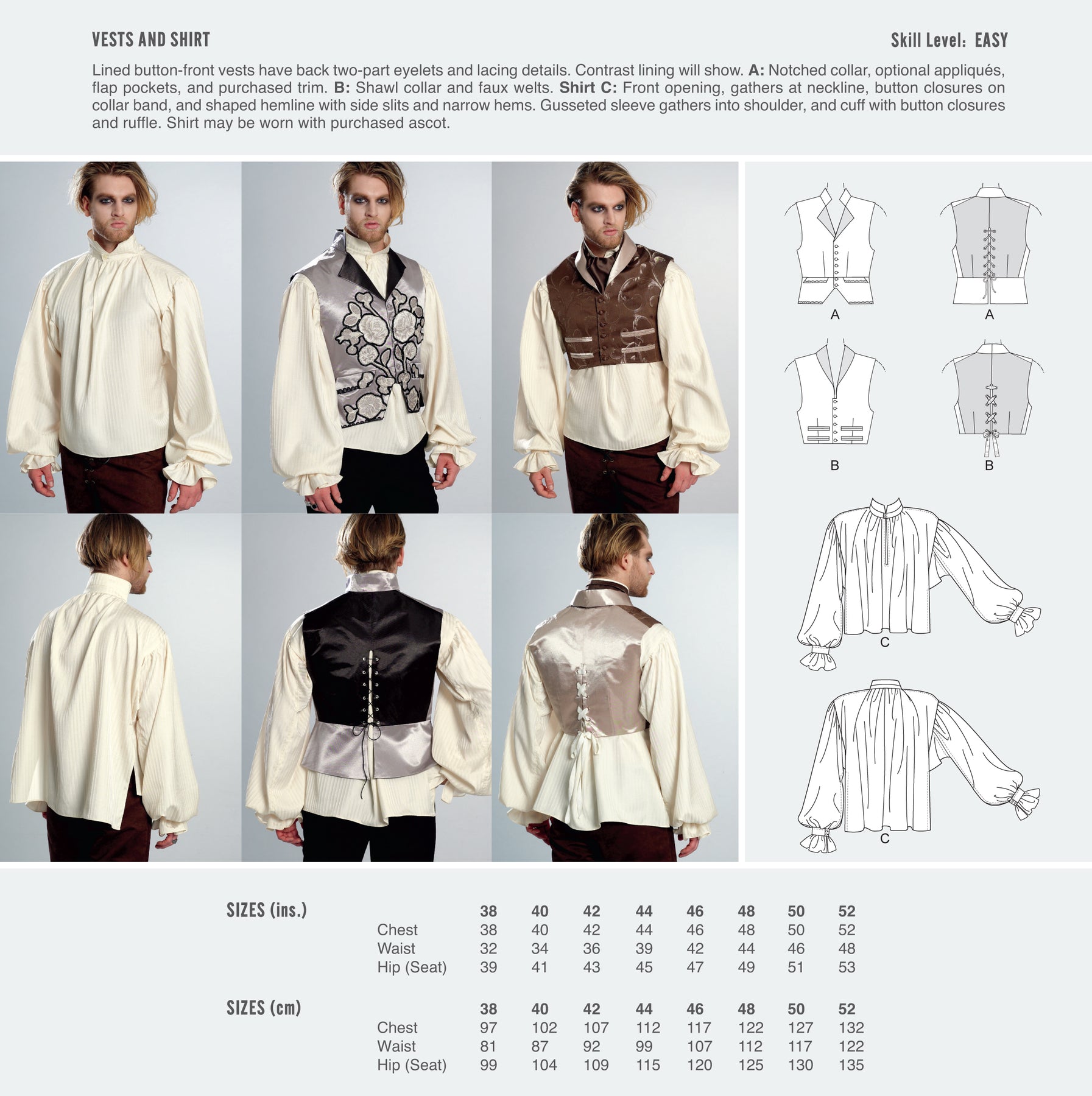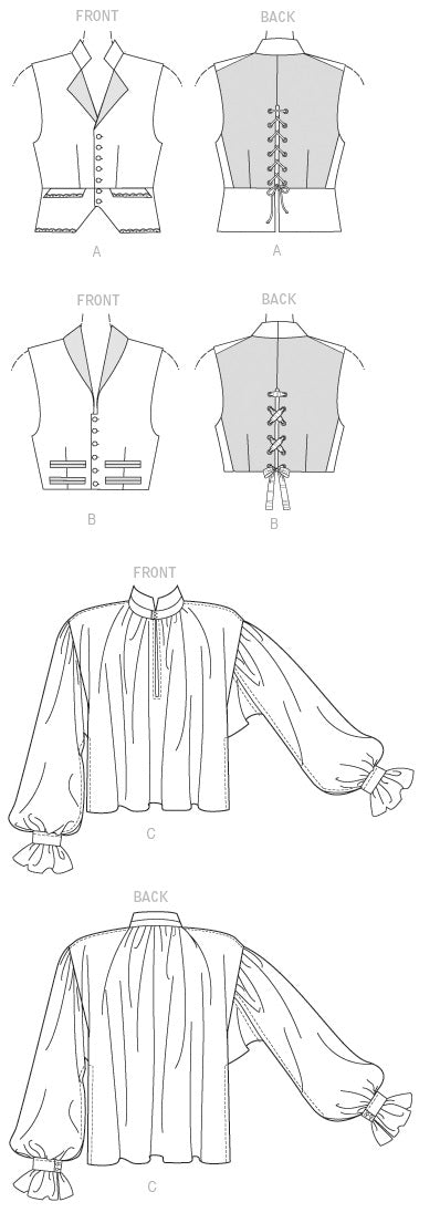 WESTEN UND HEMD Die gefütterten, geknöpften Westen haben rückwärtige zweiteilige Ösen und Schnür-Details. Das Kontrastfutter ist sichtbar. A: Mit Reverskragen, optionalen Applikationen, Taschenklappen und gekaufter Borte. B: Mit Schalkragen und falschen Paspeln. Hemd C: Vorne offen, mit Kräuselungen am Ausschnitt, Knopfverschluss am Kragensteg und geformter Saumlinie mit Seitenschlitzen und schmalen Säumen. Die Ärmel haben Zwickel, die im Schulterbereich eingekräuselt werden, mit Manschette mit Knopfverschluss und Rüsche.