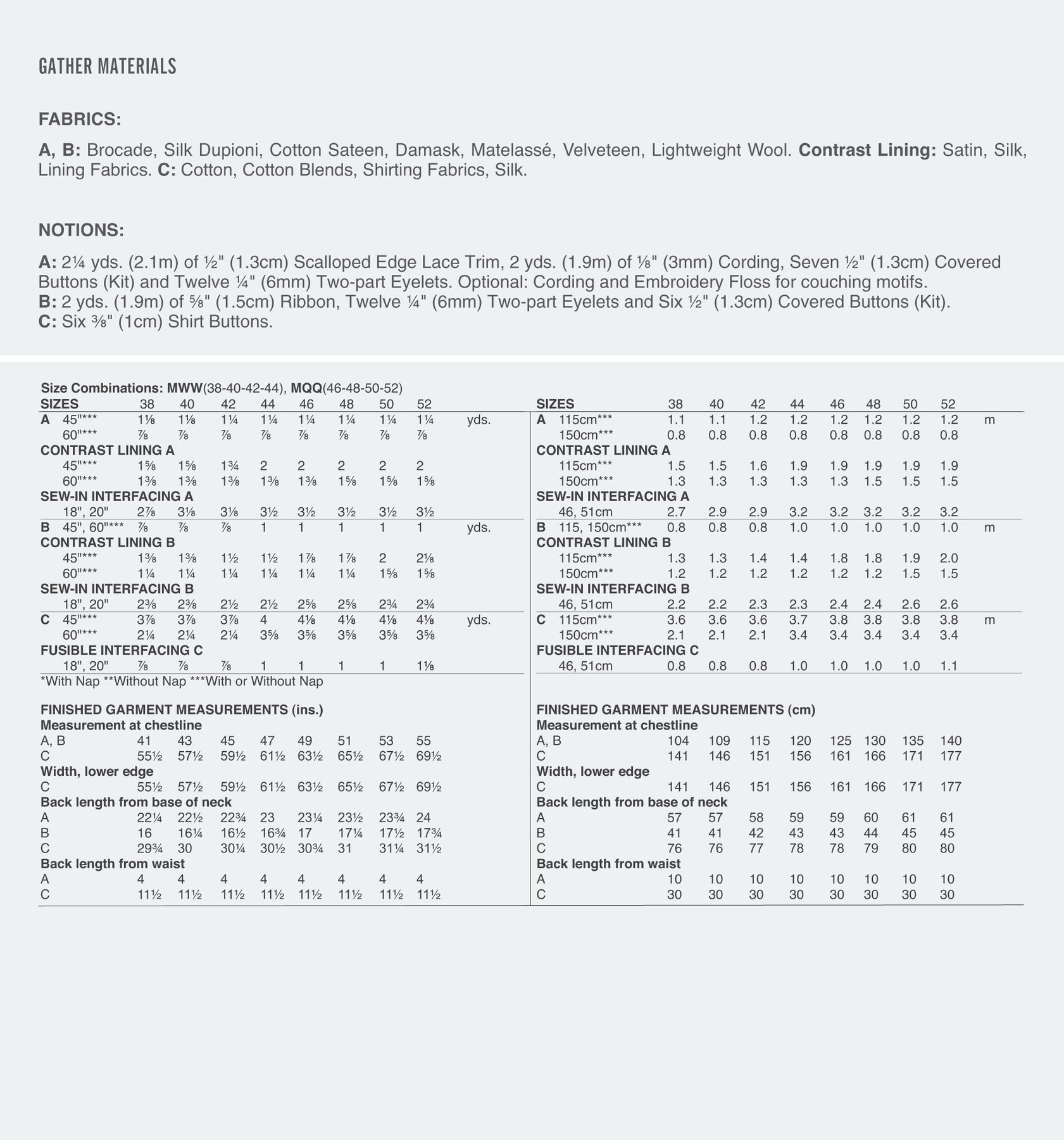 Stoffempfehlung:A, B: Brokat, Seiden-Dupioni, Baumwoll-Satin, Damask, Matelassé, Velveteen, dünne Wolle. Satin, Seide, Kontrastfutter: Futterstoffe. C:Baumwolle, Baumwollmischgewebe, Hemdenstoff, Seide.
