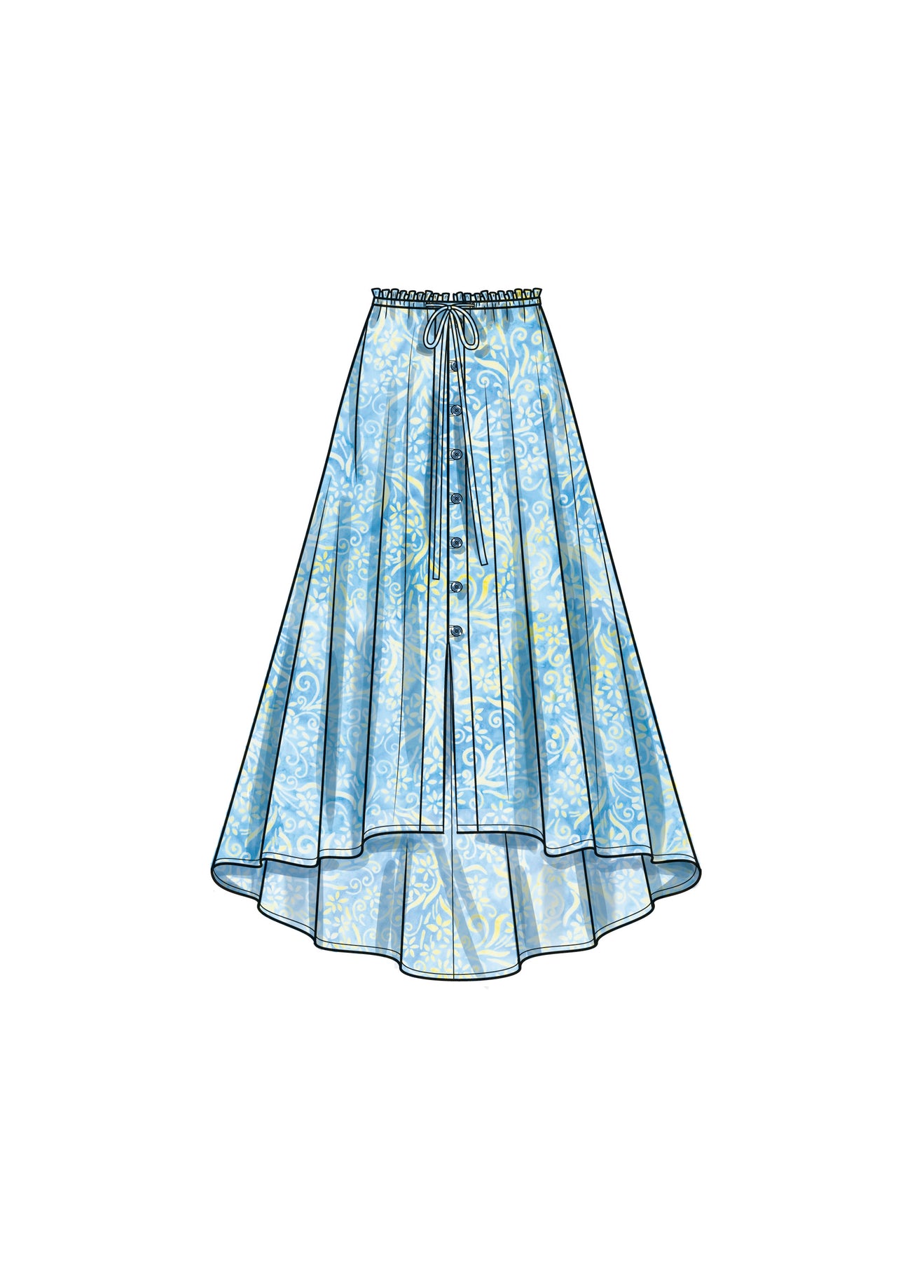 Leicht zu nähender Rock für Damen mit variierendem Saum, geraffter und gekräuselter Taille, Knopf- und Schleifenverschluss vorne, Verschluss zum Selbstbinden und Seitennahttaschen.