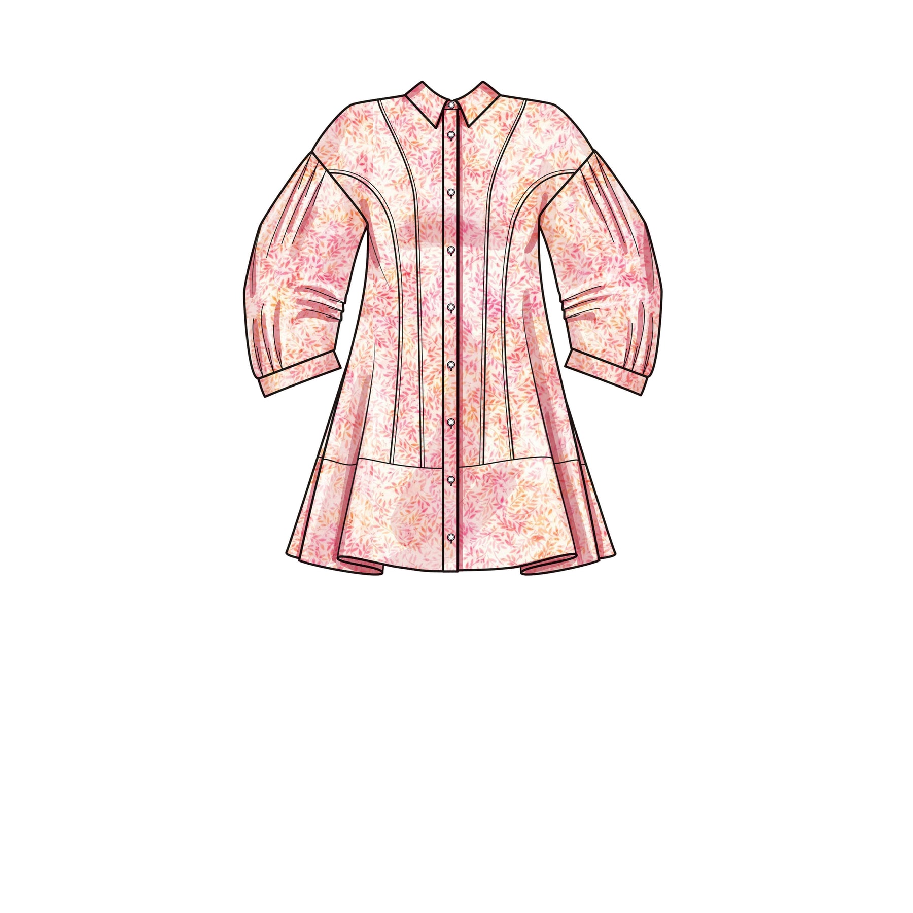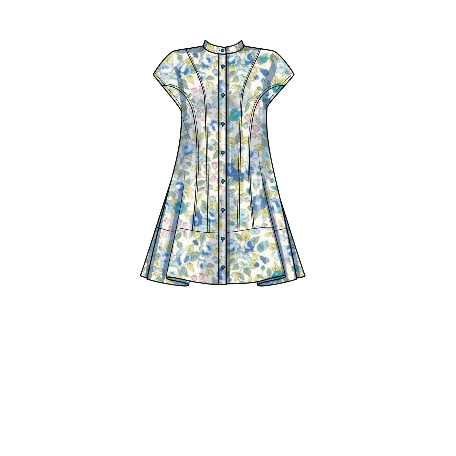 Das Hemdblusenkleid ist mit einem korsettähnlichen Mieder, Abnähern am Rücken und einem ausgestellten Saum in Minilänge geformt. Die Ansichten A und C haben klassische Kragen. Ansicht A hat überschnittene Schultern und Puffärmel mit Bändern. Ansicht B hat ein Nackenband mit kurzen Ärmeln. Ansicht C hat geraffte transparente Ärmel mit 3/8"-Gummizug am Saum.