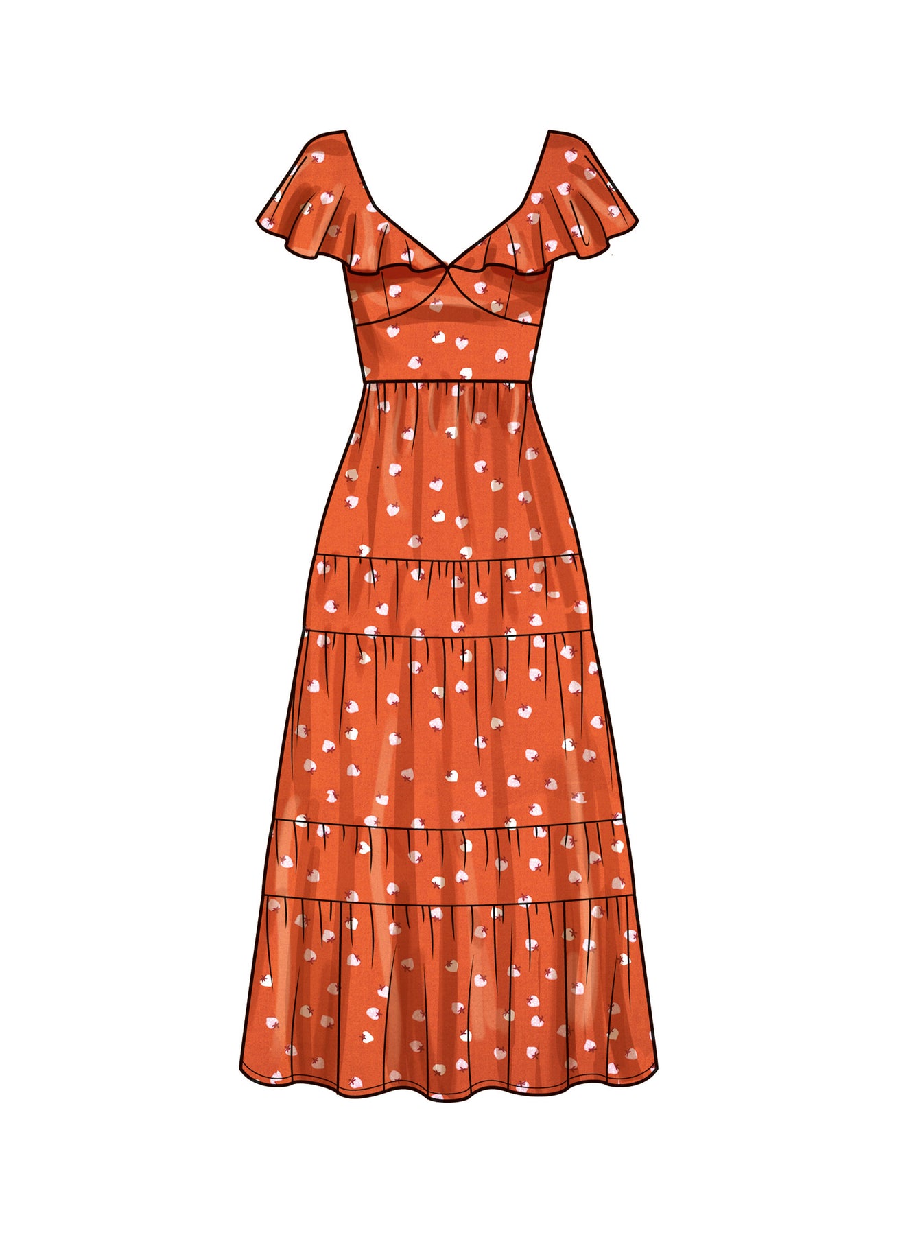 Volantkleider mit V-Ausschnitt und Brustabnähern gibt es in drei Längen. Dieses Schnittmuster hat leichte Raffungen an der Taille und einen gerafften Stufenrock. Die Kleider haben ein Futter in Mieder und Passe, einen unsichtbaren Reißverschluss und Seitennahttaschen.