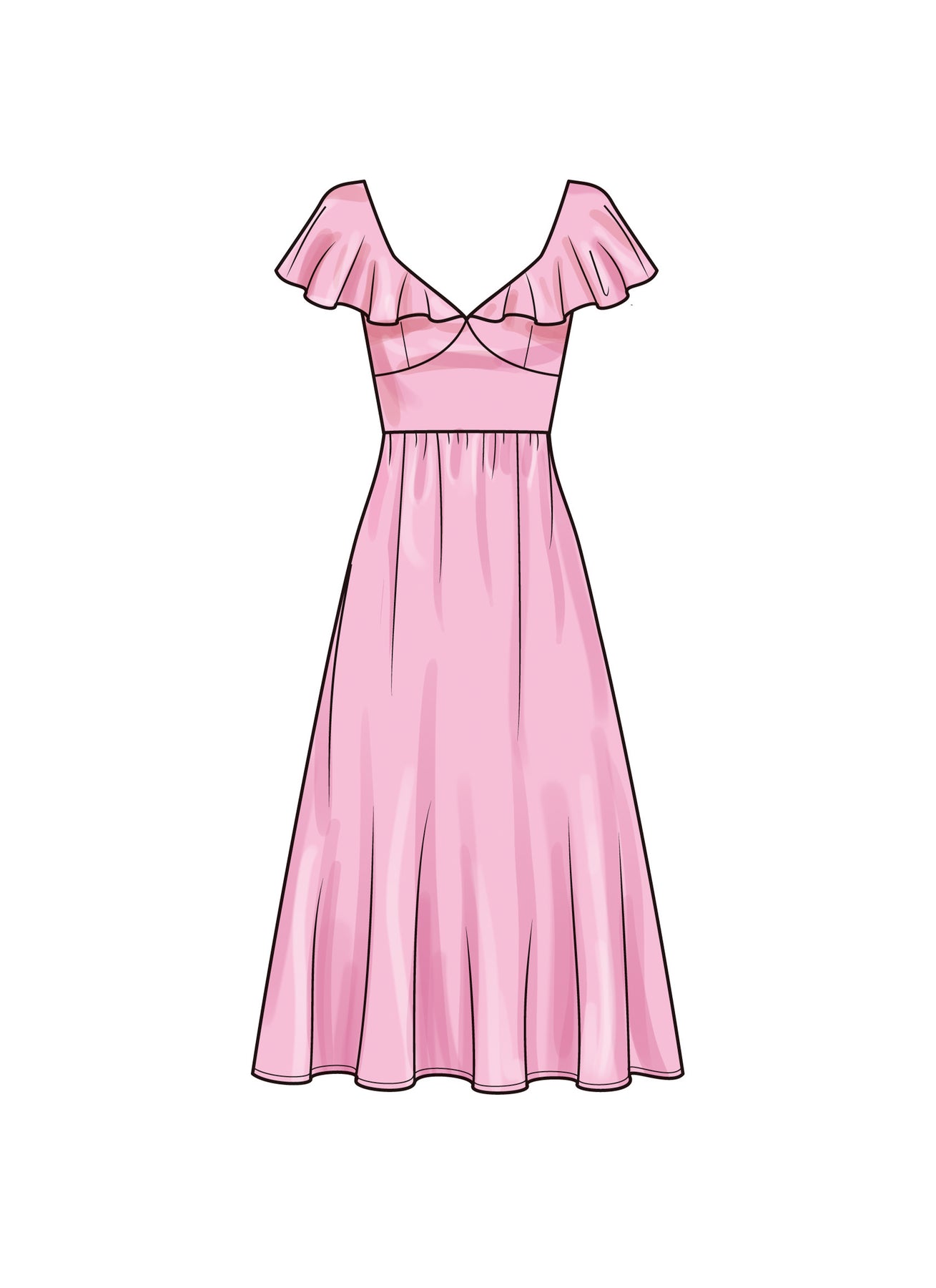 Volantkleider mit V-Ausschnitt und Brustabnähern gibt es in drei Längen. Dieses Schnittmuster hat leichte Raffungen an der Taille und einen gerafften Stufenrock. Die Kleider haben ein Futter in Mieder und Passe, einen unsichtbaren Reißverschluss und Seitennahttaschen.